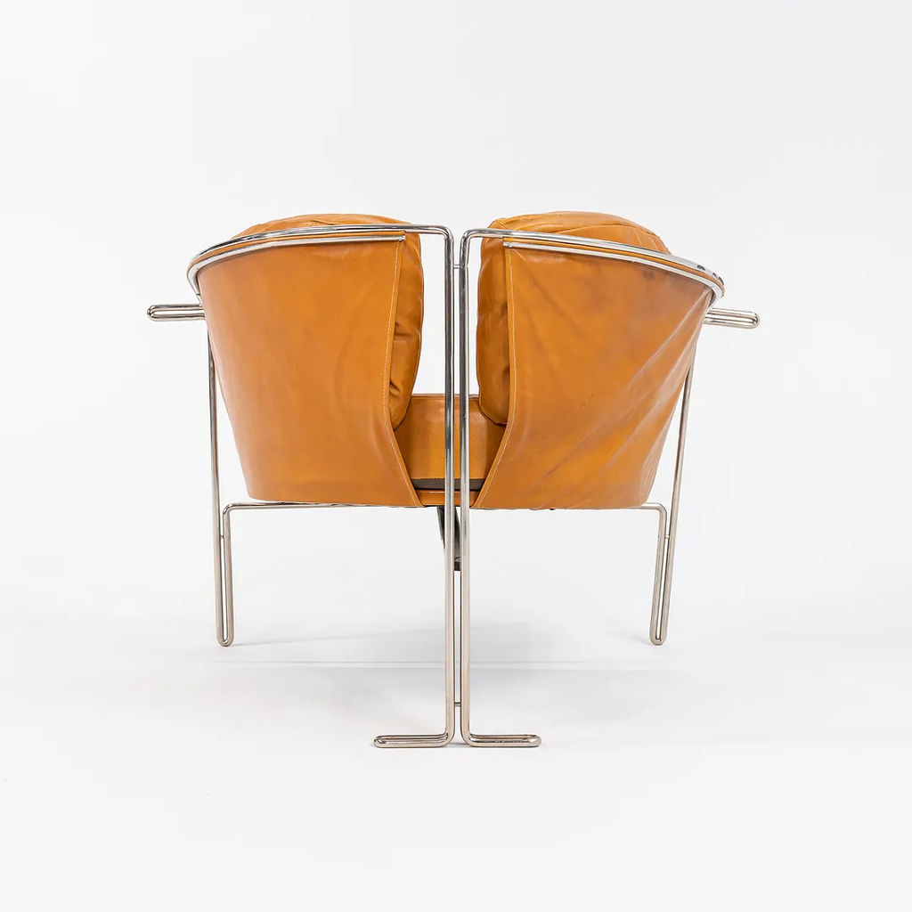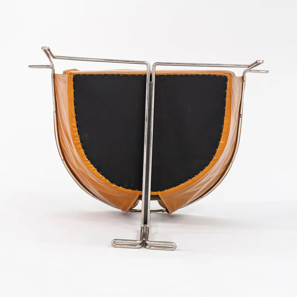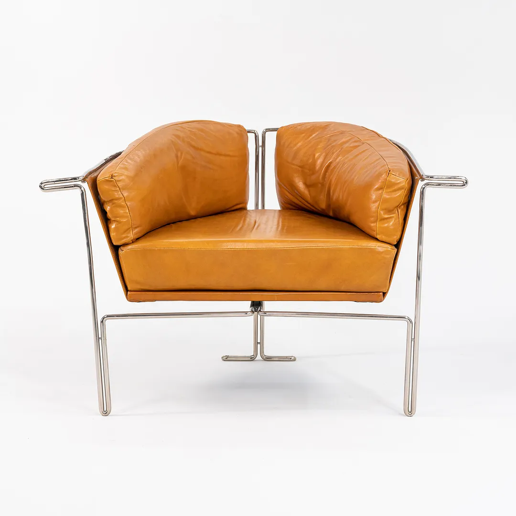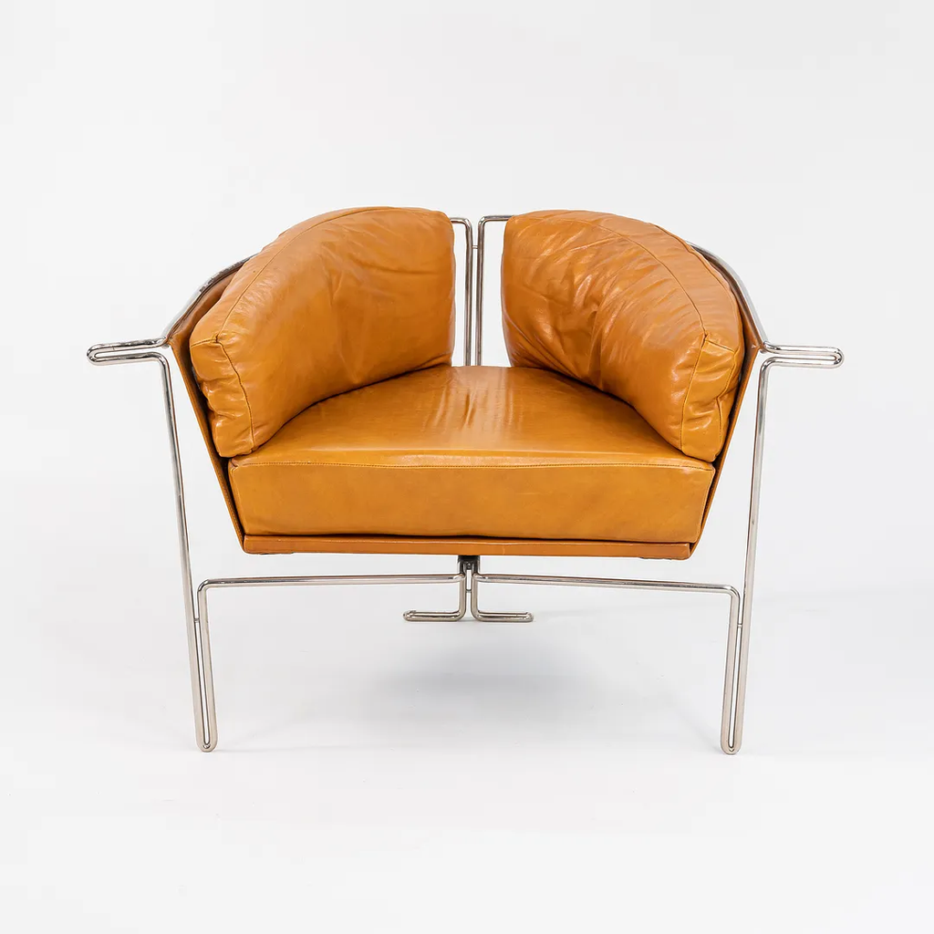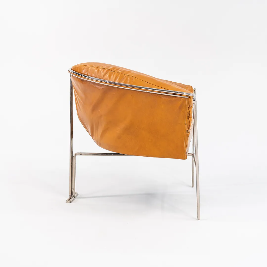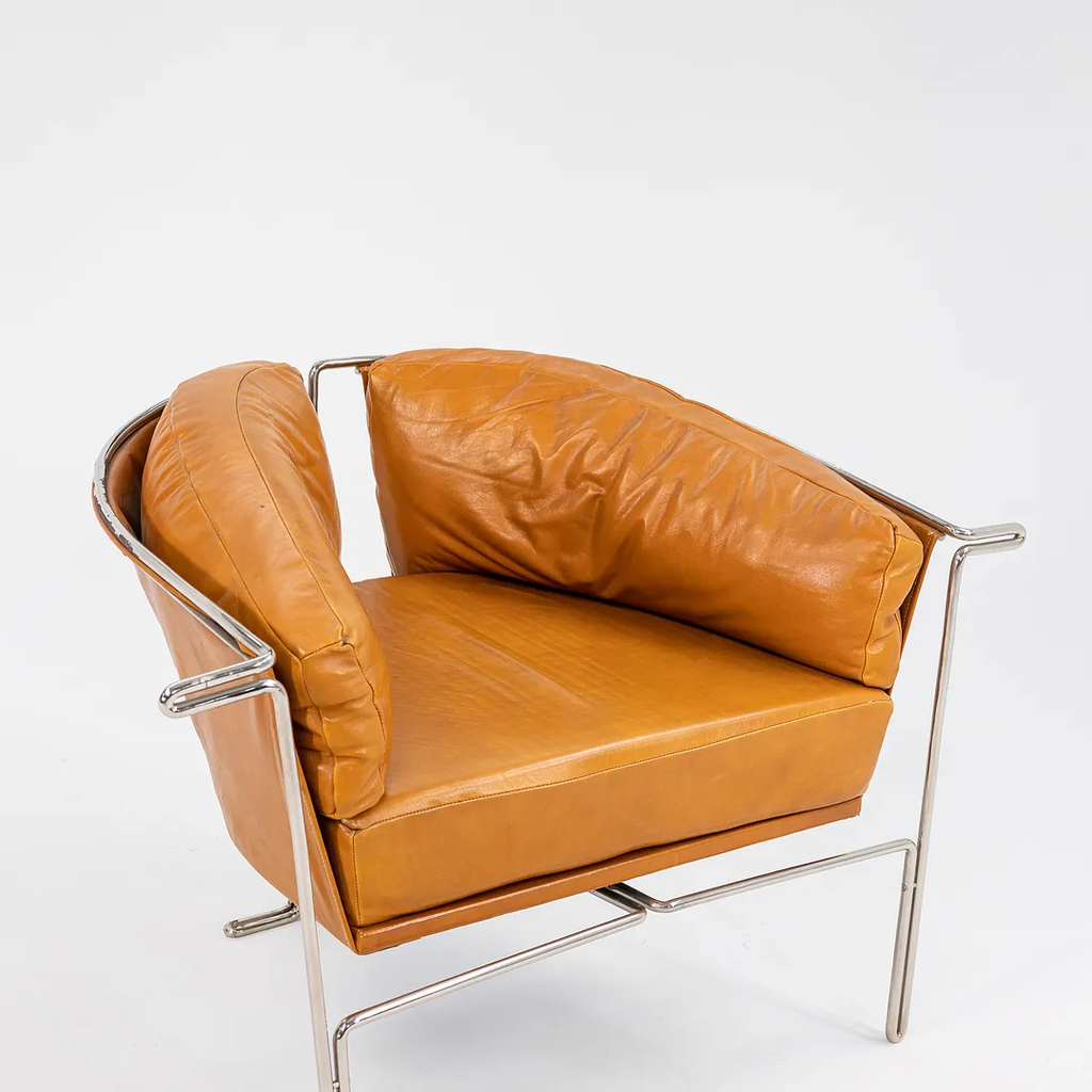 This is a rare prototype lounge chair from the Entelechy series, designed by architect John Portman and produced by Saporiti-Italia. This was part of the Gratz Industries private collection and came directly from Gratz's facilities. It is upholstered in a light cognac leather with chromed steel frame.