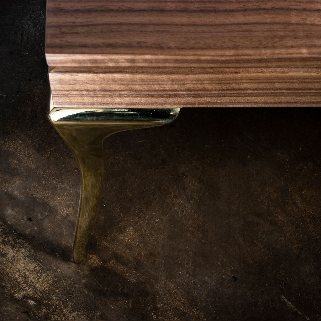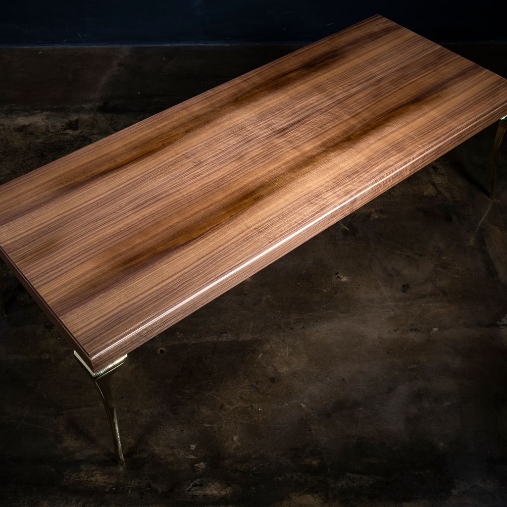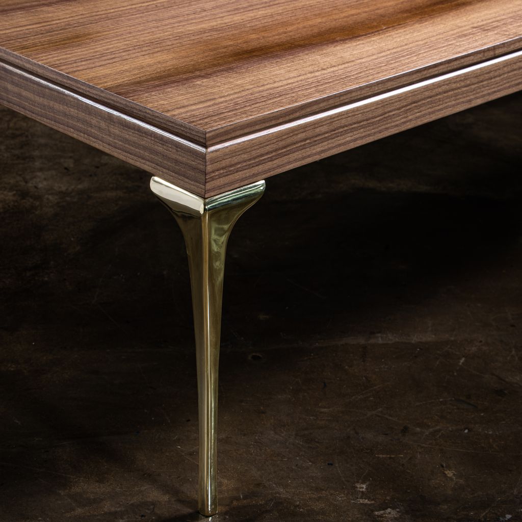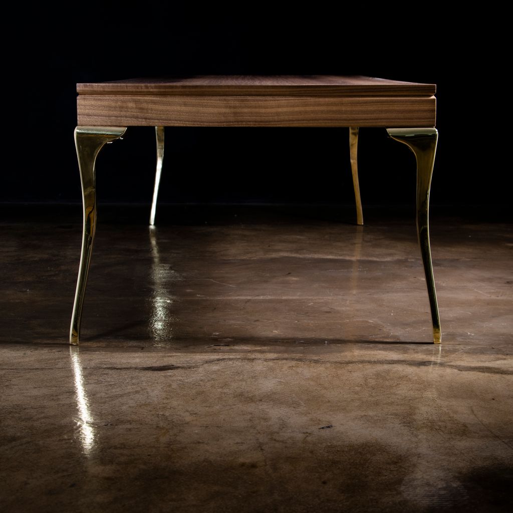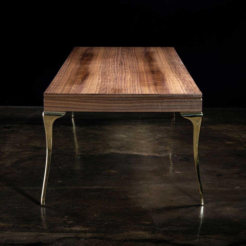 The Enzio Table features a contemporary take on the classic Queen Anne leg, cast in bronze. Shown here in natural walnut but available in any species, finish or material and customizable to your desired dimensions.