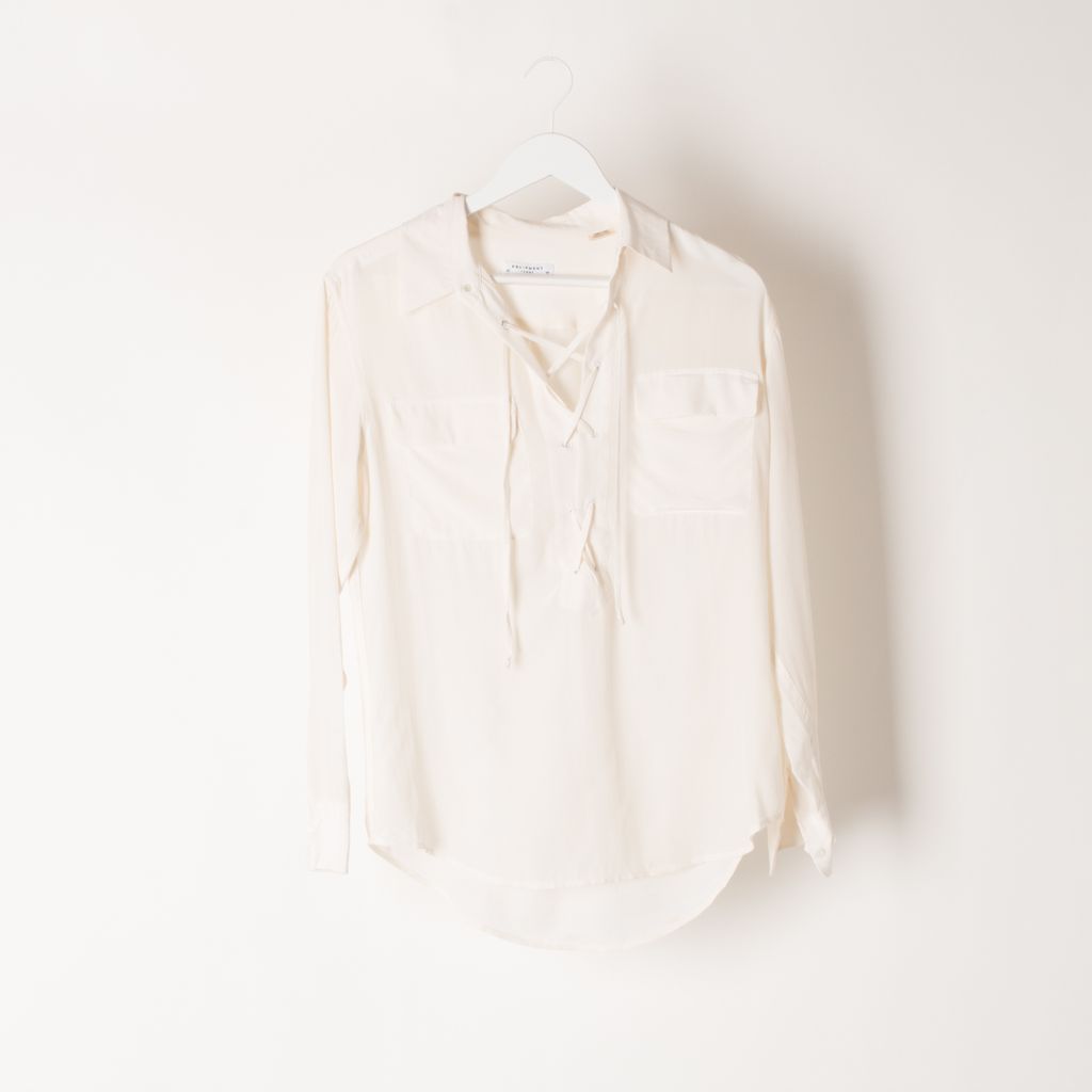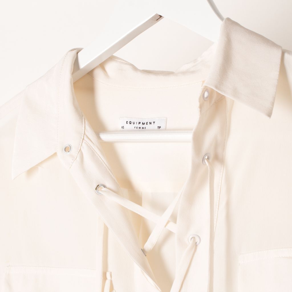 Like new, lace up top from Equipment Femme. 100% silk featuring a spread collar front, lace-up finish, double front pocket and a rounded hem.