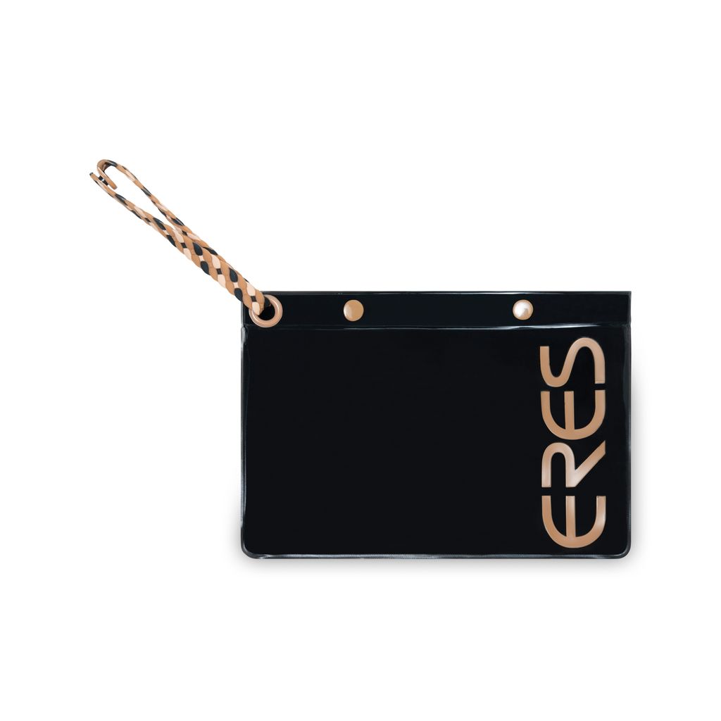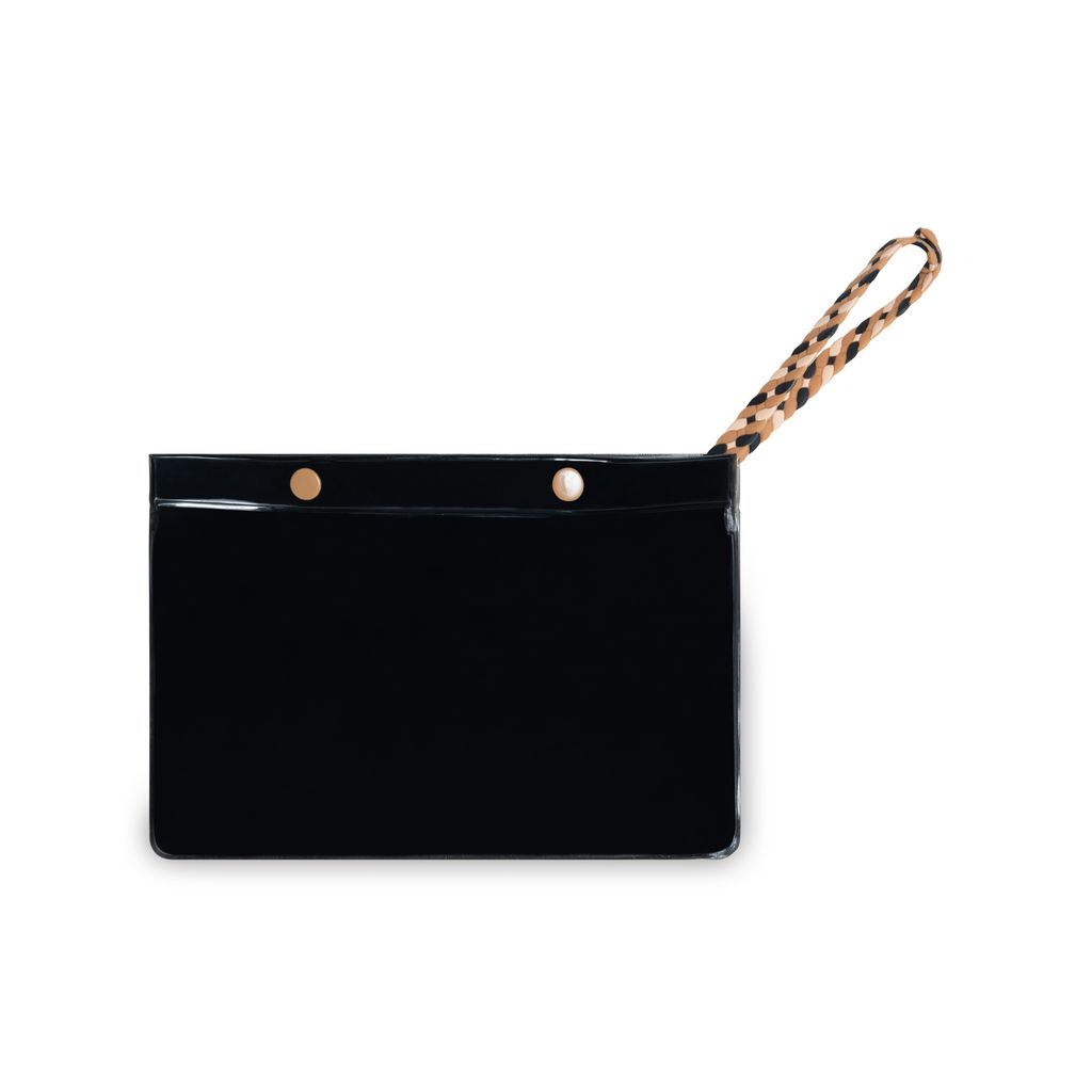 ERES Black PVC Clutch features tonal hardware, braided wrist strap, and snap closure at top.