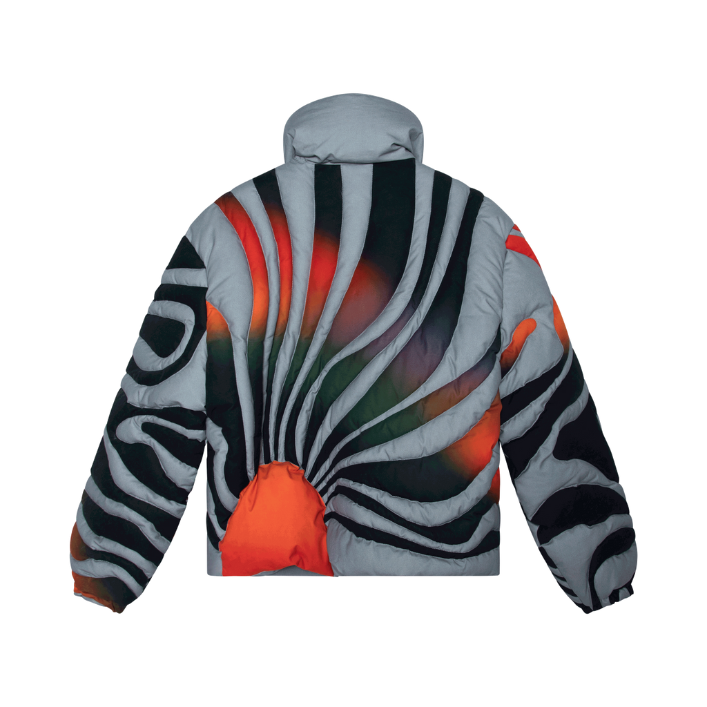 ERL Pattern-Panelled Bomber Jacket features multi color abstract gradient design, down feather filling, classic collar, and concealed front closure.