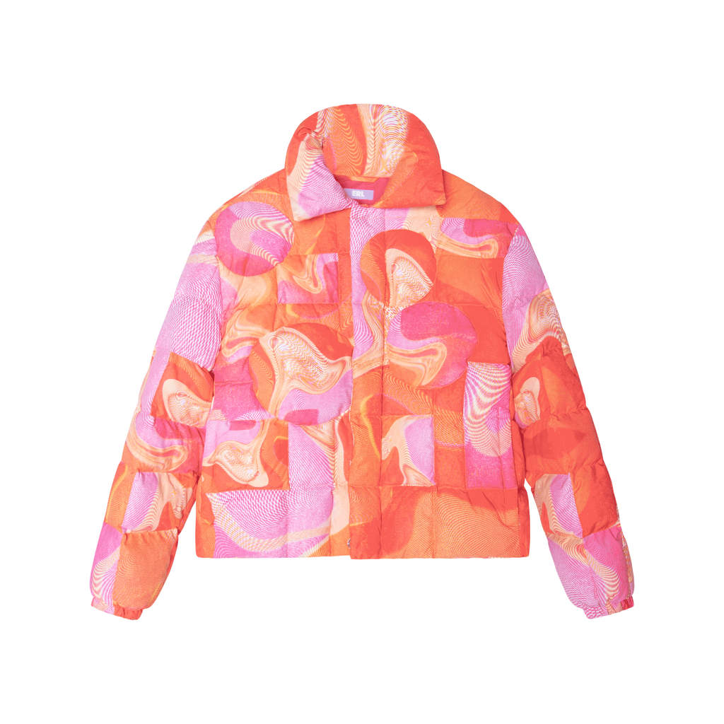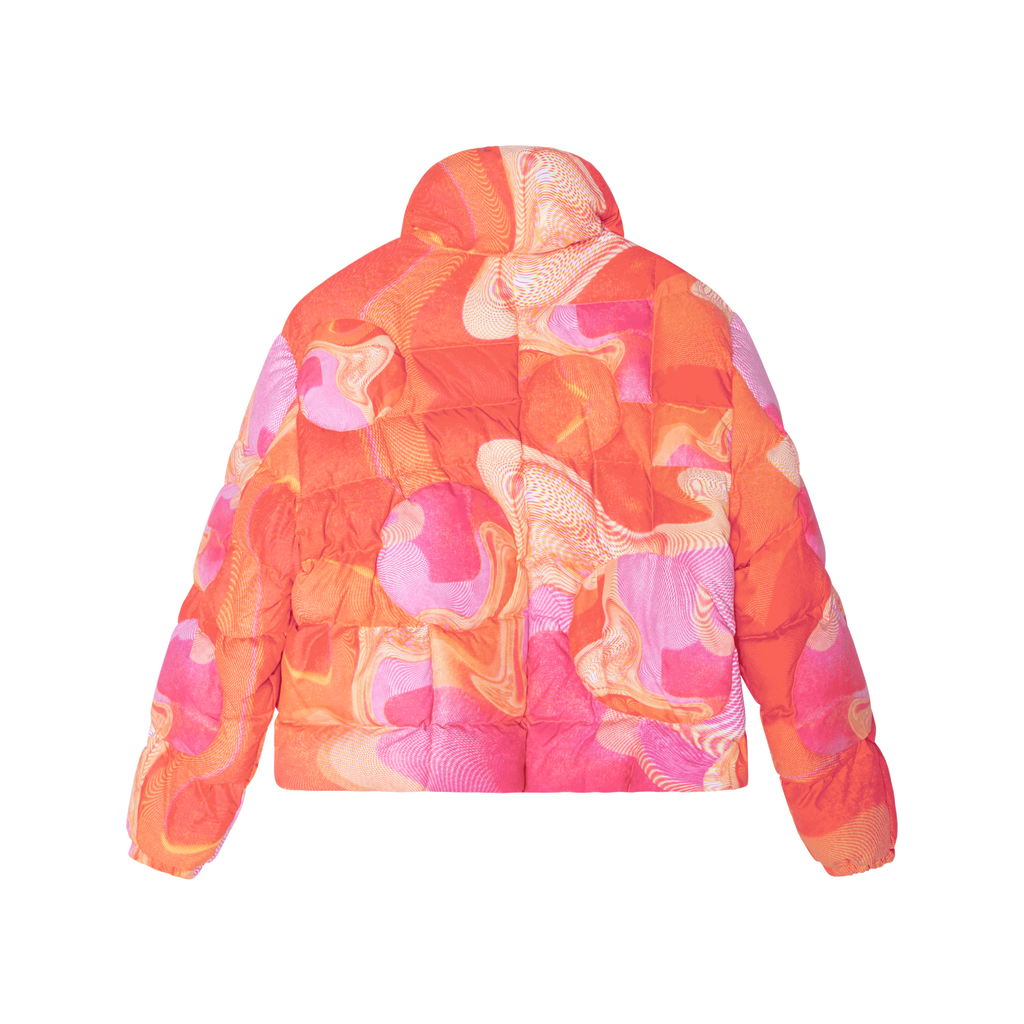 ERL Swirl Print Panelled Quilted Down Jacket in Pink features pink psychedelic swirled print, circular quilting, spread collar, dropped shoulder seams, and zip and press-stud fastening down front.