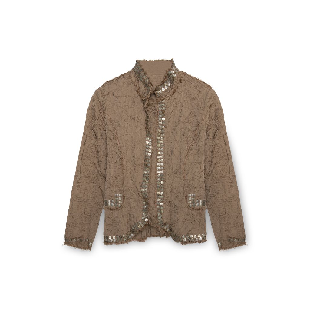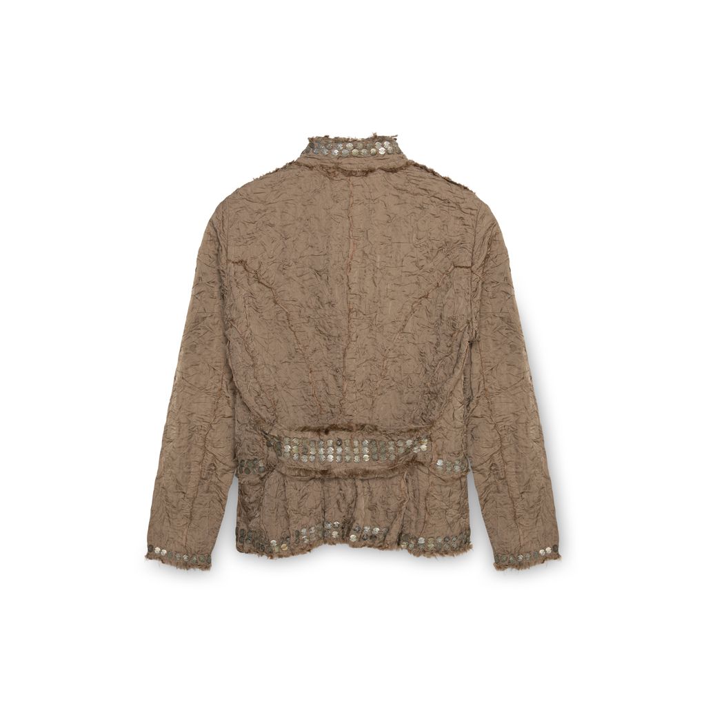 Ermanno Scervino jacket features crinkled quilted fabric throughout with mini coins detail on all trimmings. Jacket features two sides flap pockets. slits at back, and invisible button front.