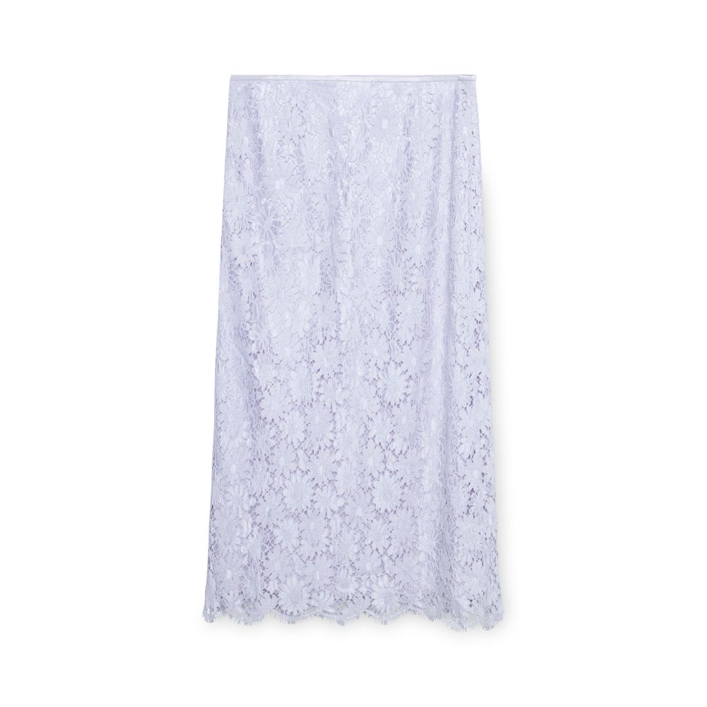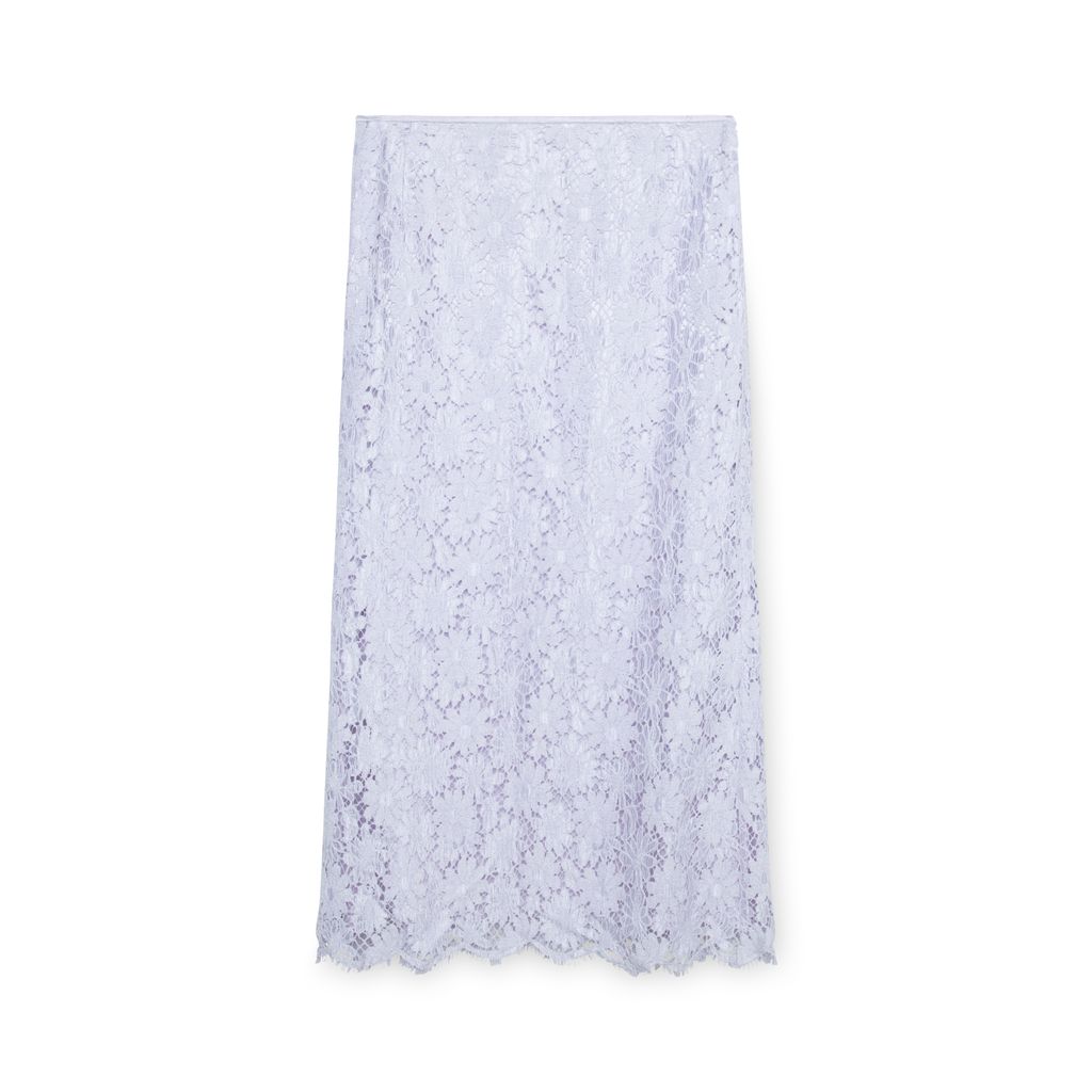 Escada Lavender Lace Maxi Skirt features scalloped trim, hidden side zipper, and all over lace detailing.