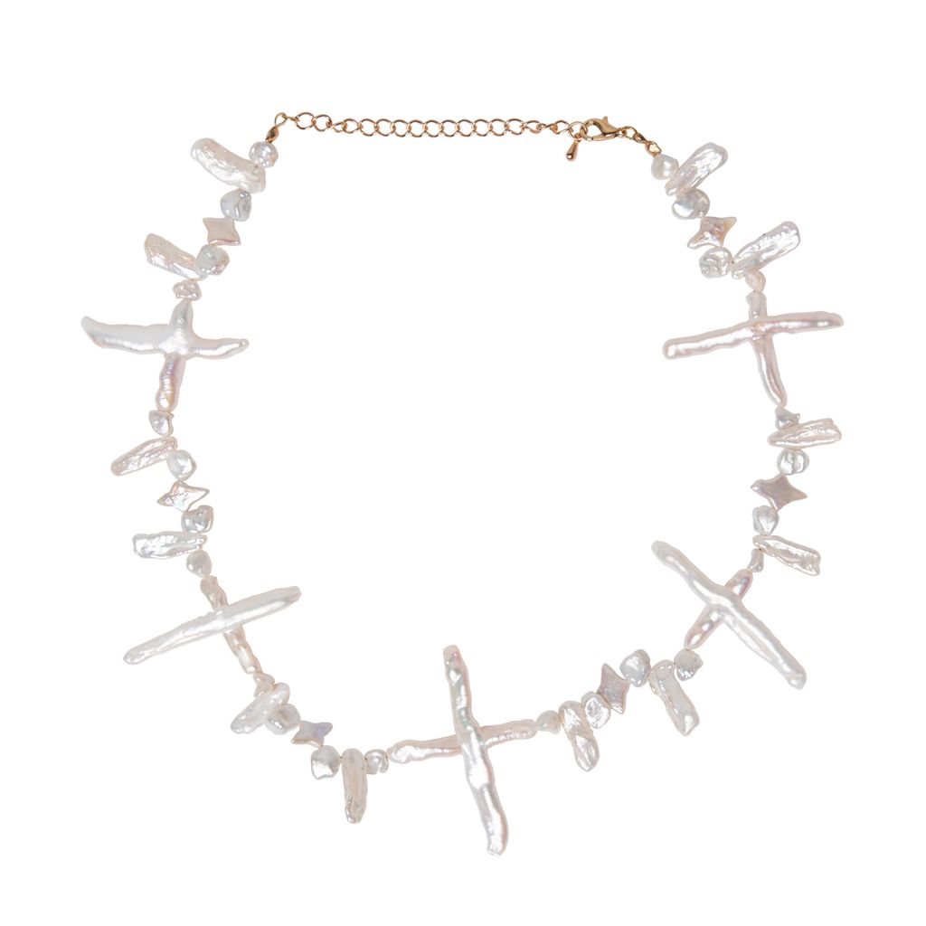 Eternal Bliss Necklace features cross freshwater biwa pearls with various white pearls and a nickel free adjustable clasp. This necklace is inspired by the allure of angels.