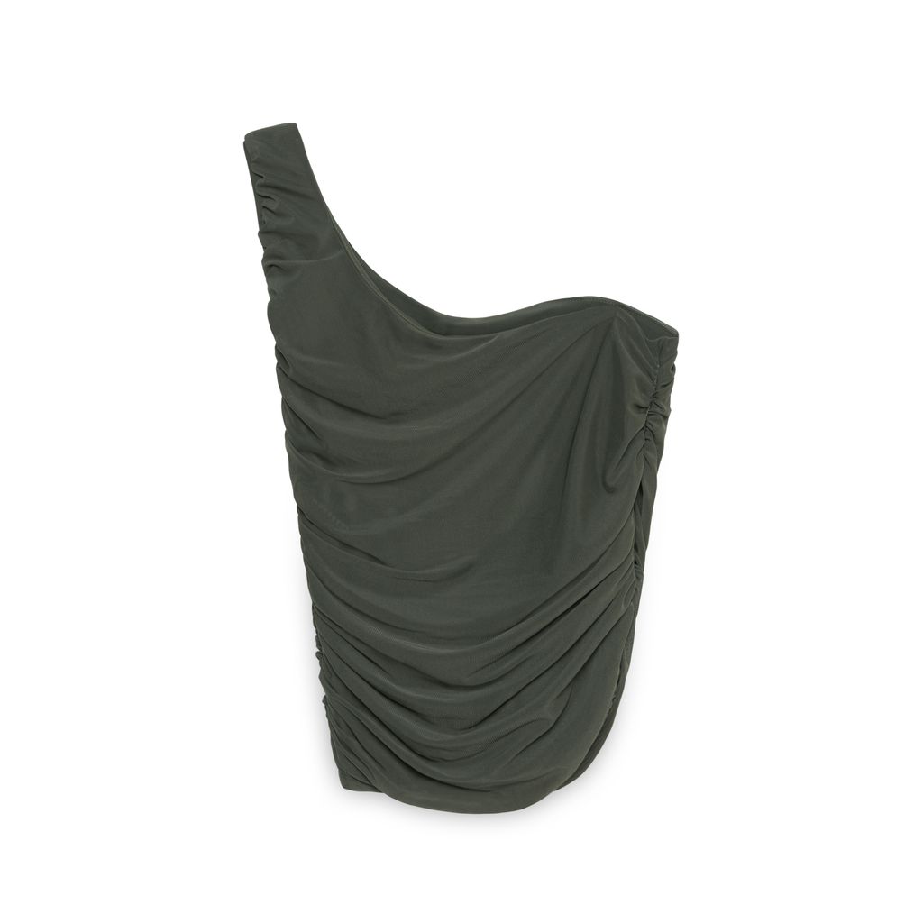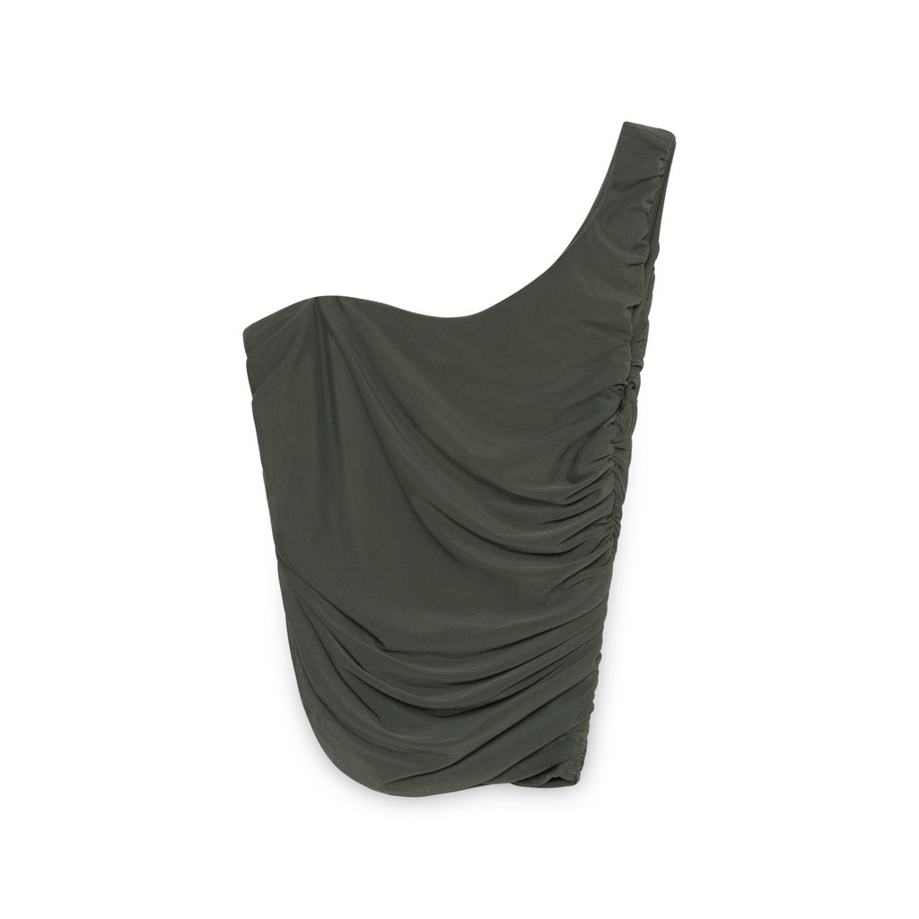 Eva Top features double layered top, one shoulder design with ruched detailing, and power mesh and spandex material. Made in Los Angeles.