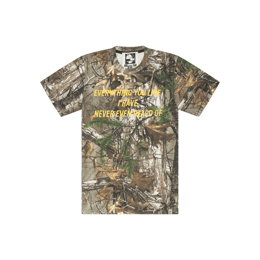 Everything You Like Camo Tee features graphic on front and back.