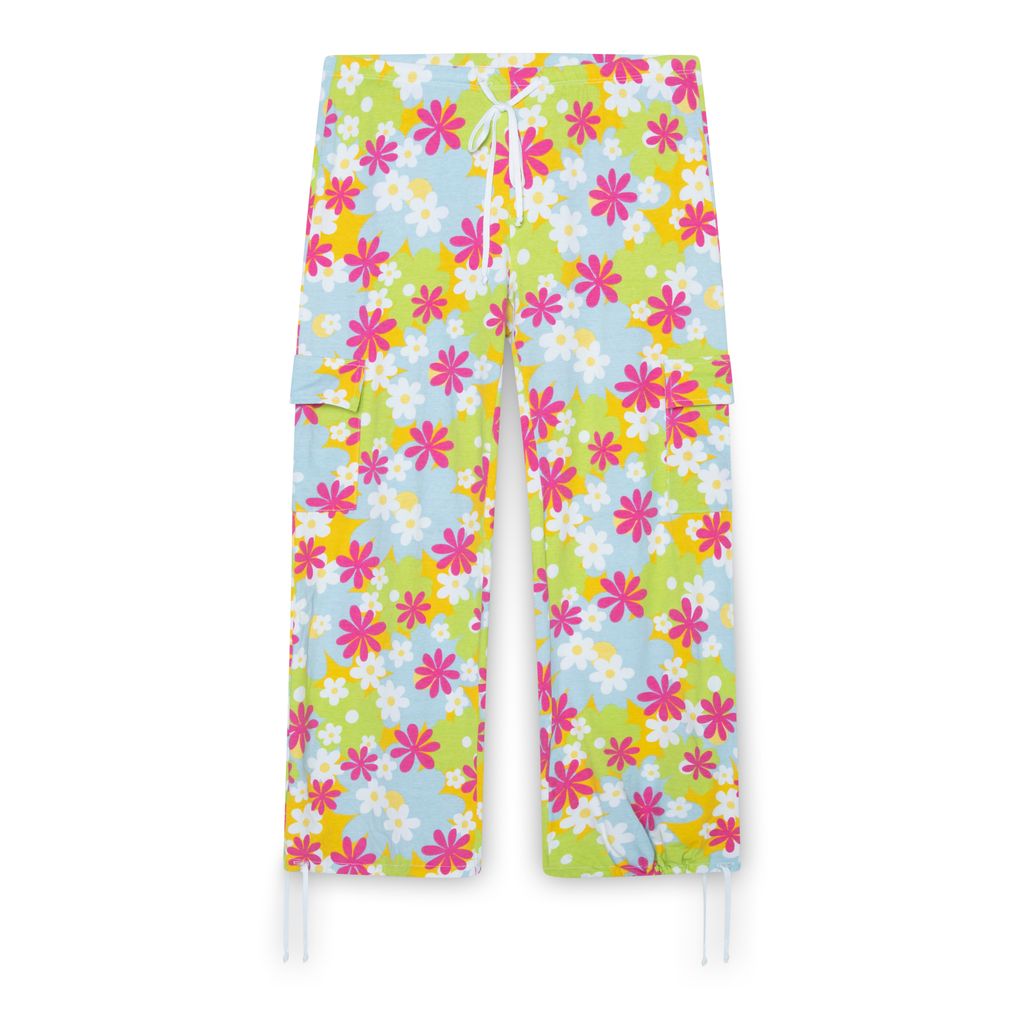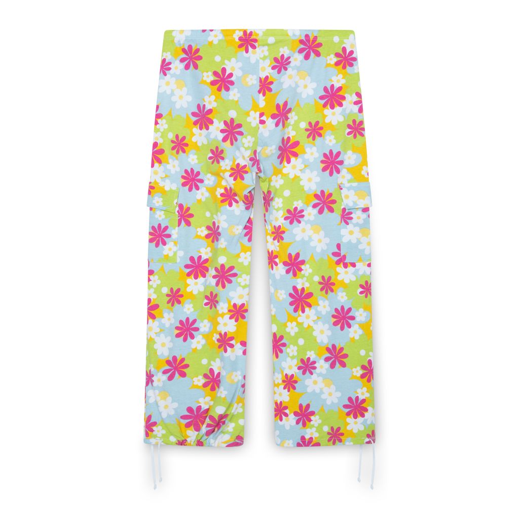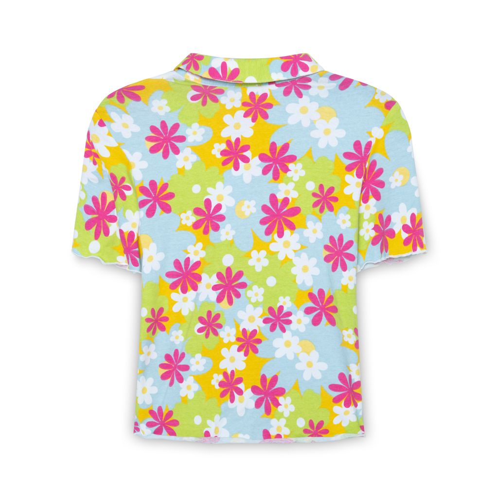 Evewear Flower Child Pajama Set features side slit with tie, button up collar shirt, and lettuce edge hem.