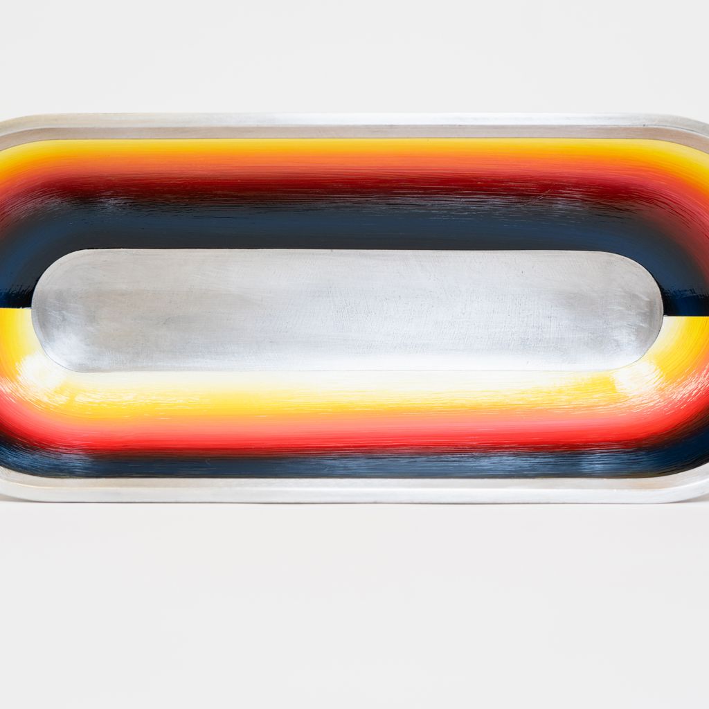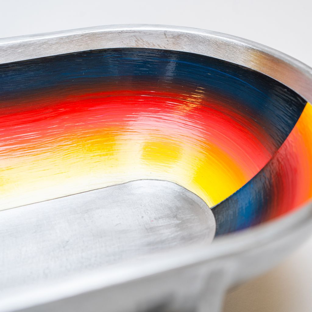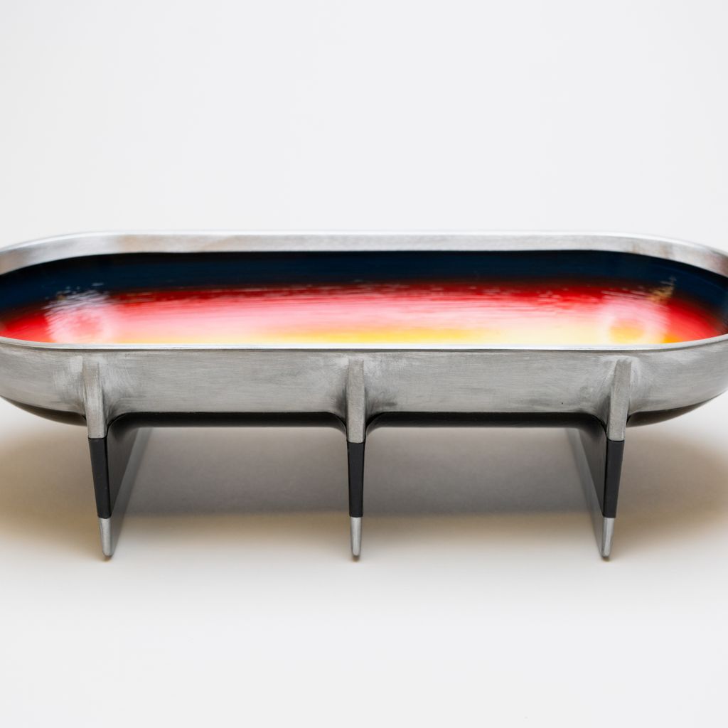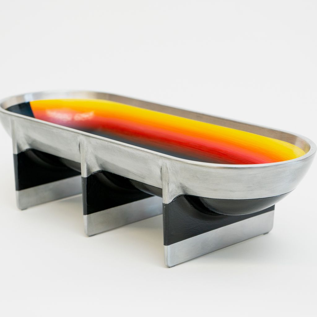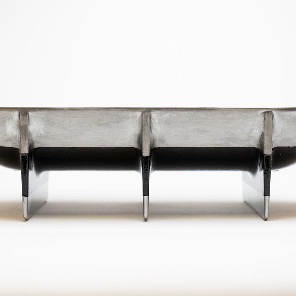 The die cast aluminum Standing Bowl is elevated off the table surface by its architecturally inspired planar legs. Each bowl is polished aluminum that is intentionally left unfinished so that it will naturally develop a patina with time and touch.