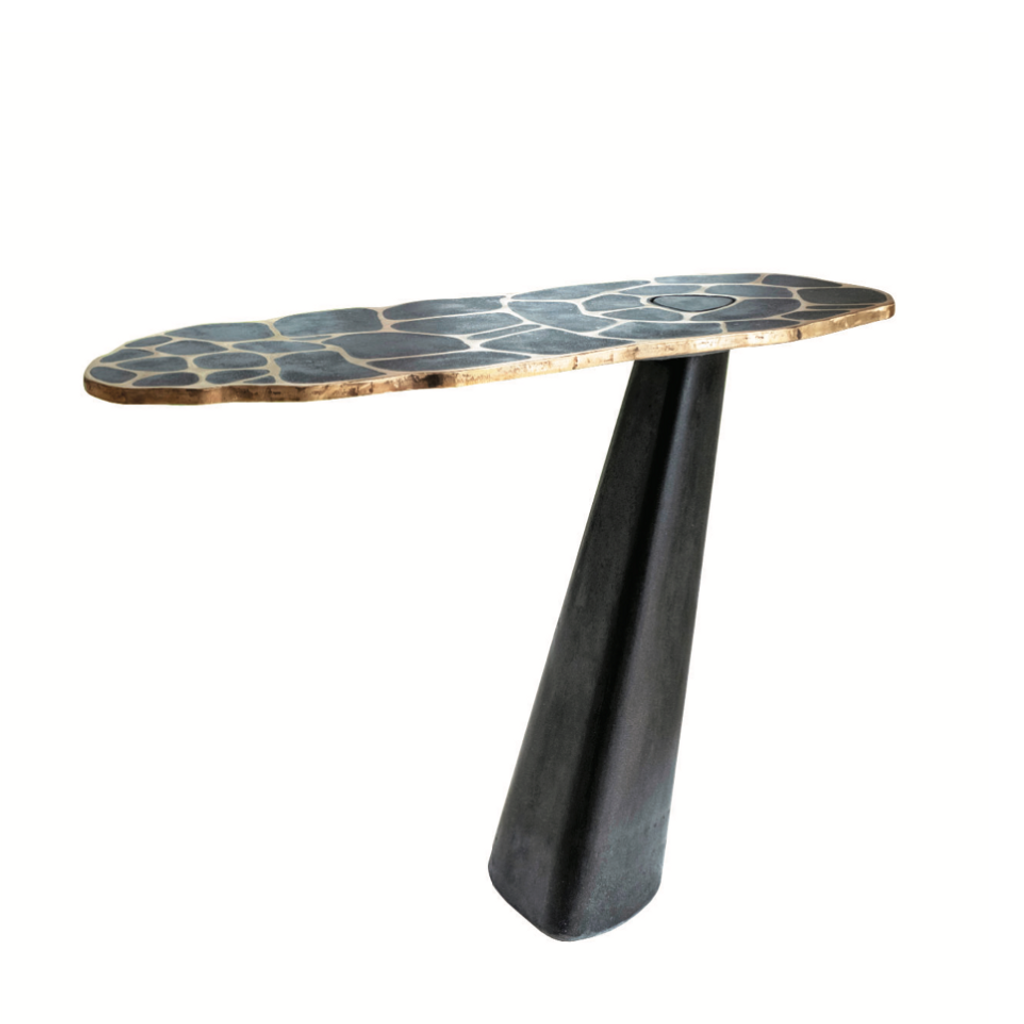The Leaning Lotus Exo Console is a younger sibling of the three-tiered Hatter Exo Leaning Shelf, currently shown at Maison Gerard. The Leaning Lotus Exo Console was a private commission by a collector, a 5th piece in their Exo collection. The piece lives beautifully next to a Lotus Exo Dining Table, acting as butler to service. The base of the table leans strikingly while supporting the bronze adorned concrete top. The Lotus patterned top is fixed by way of gravity alone, requiring no hardware. This balance combined with strength showcases a soft beauty and the engineering skill of a master concrete artisan.