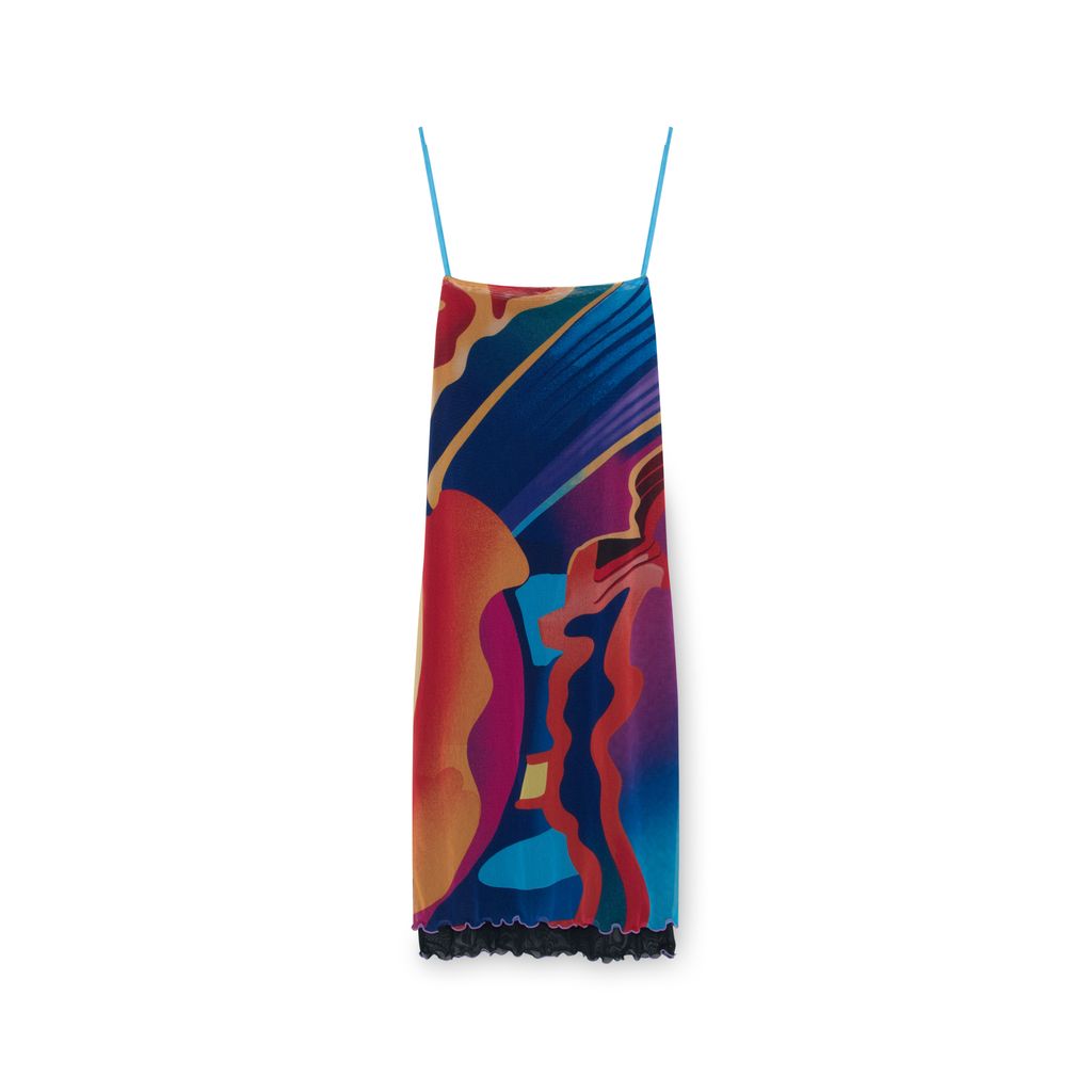 Expired Girl Mesh Midi Dress features spaghetti straps, straight neckline, black mesh lining and purple lettuce trim at hem.