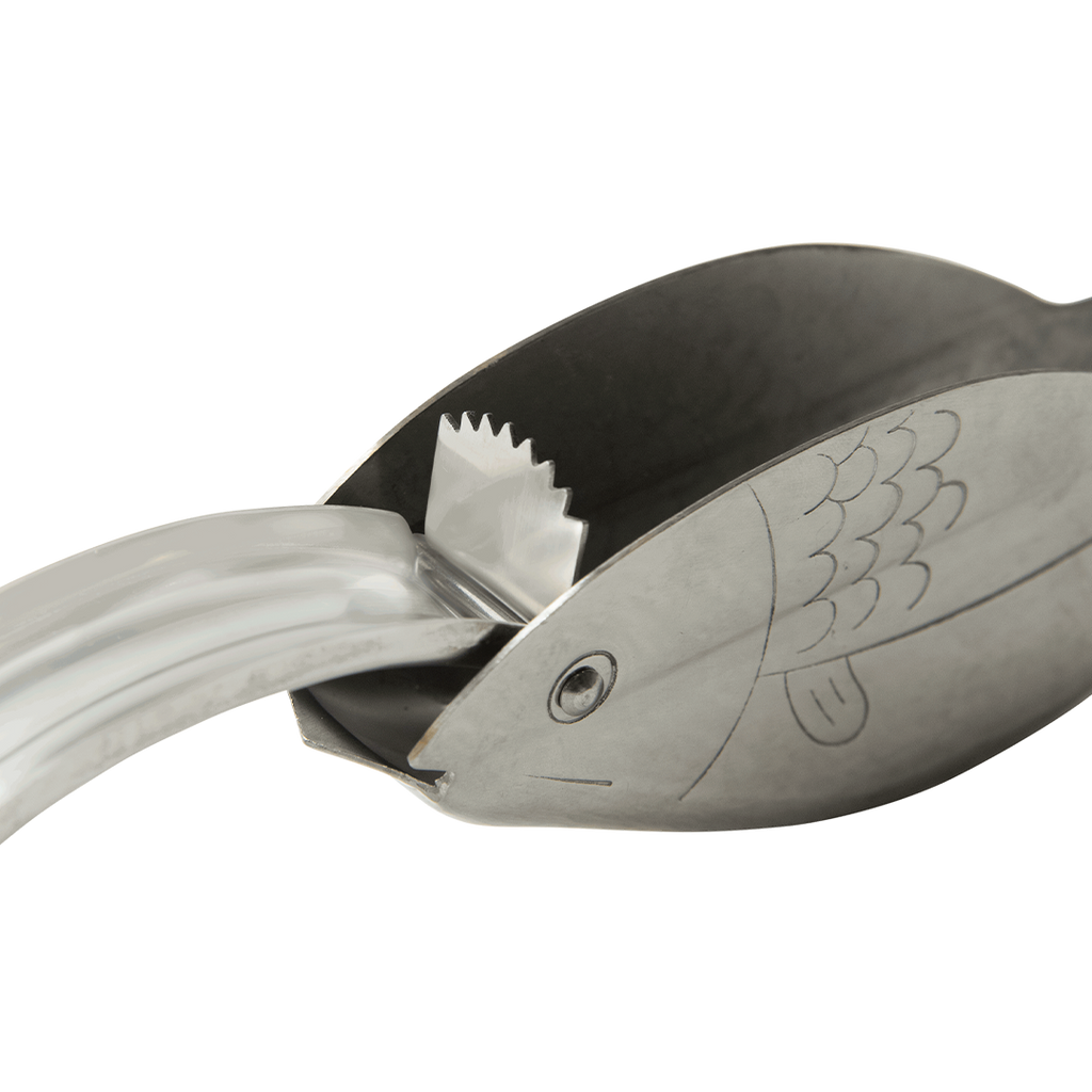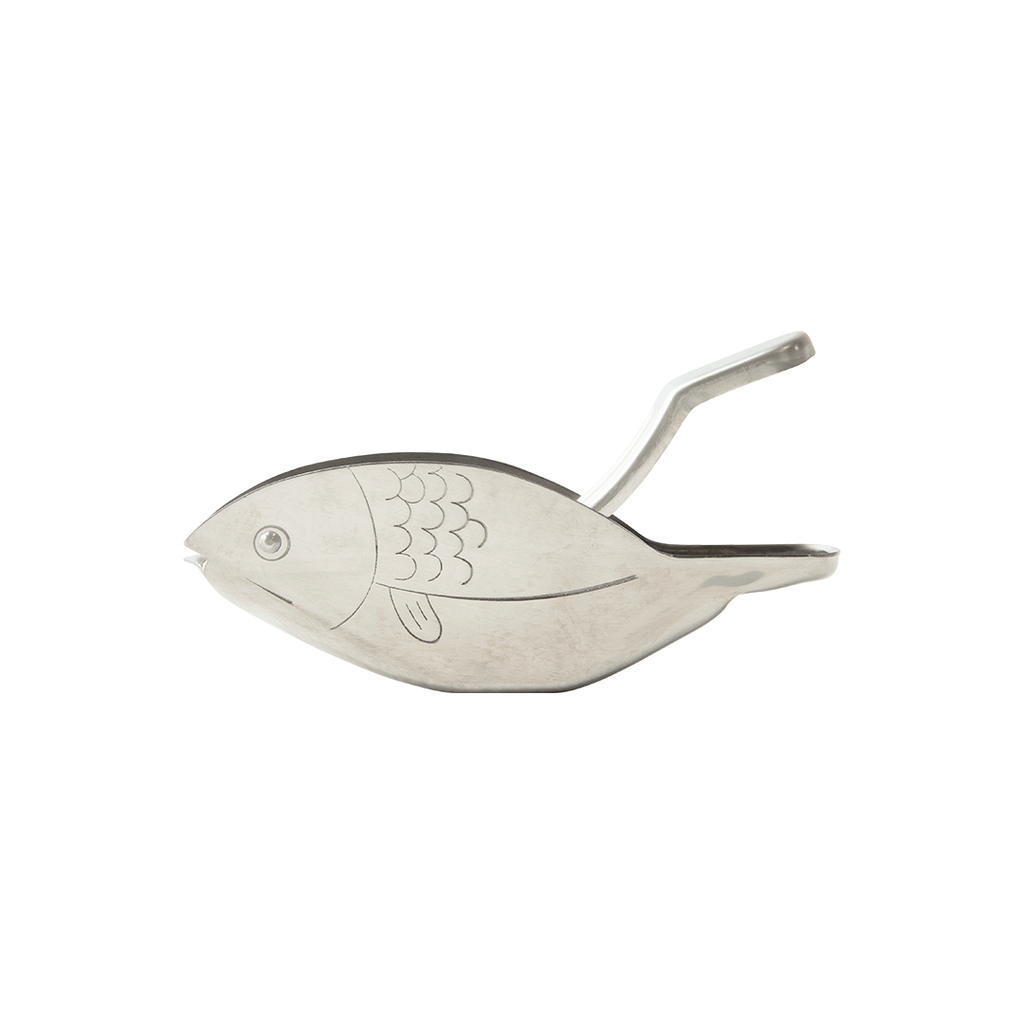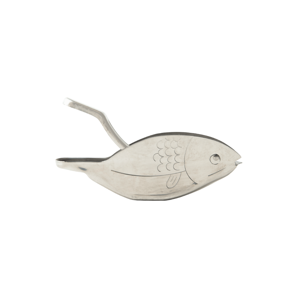 Fish shaped silver lemon/lime wedge juicer with etched detail. This item has a lightly distressed, vintage-effect.