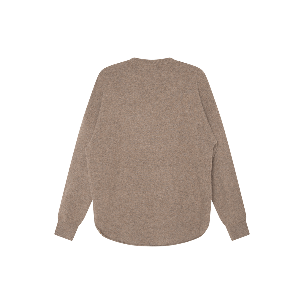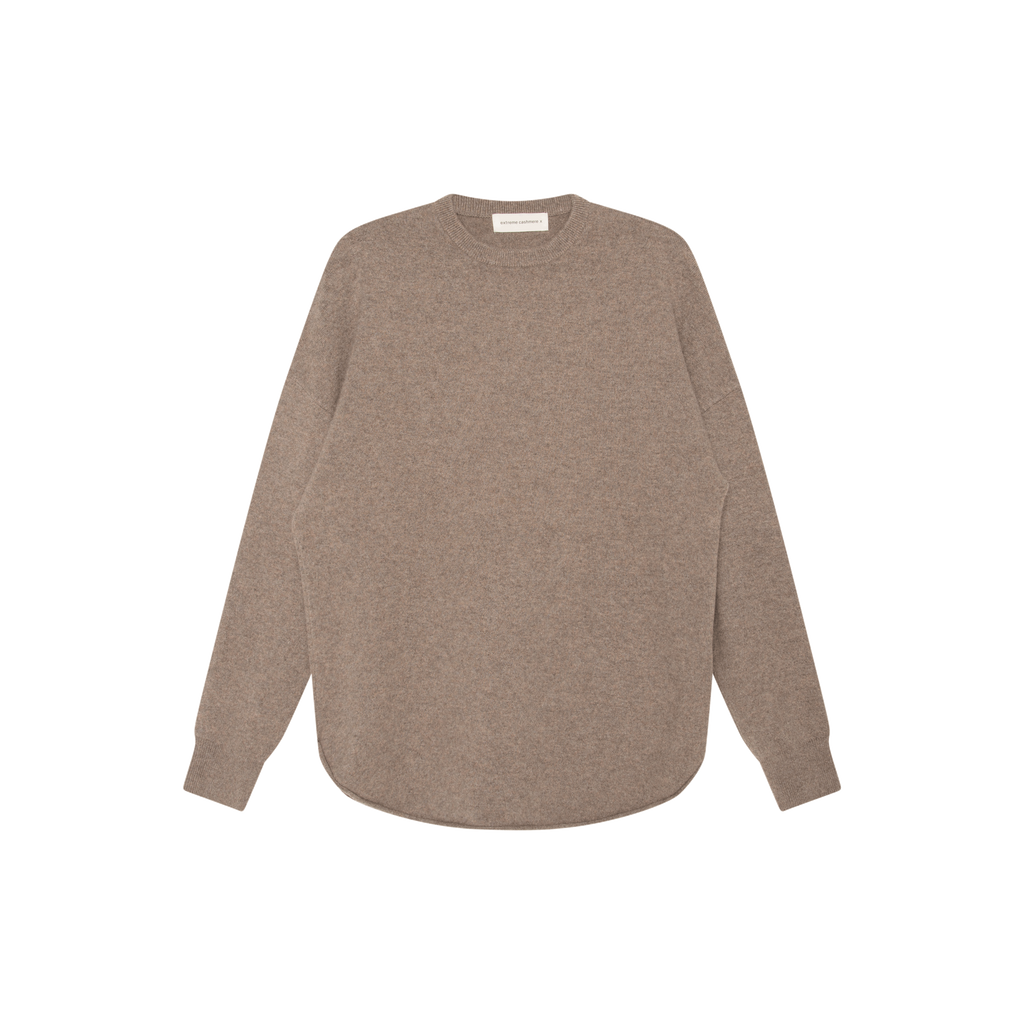 Extreme Cashmere Brown Rolled Edge Sweater features curved rolled edge, crew neck, and oversized fit.