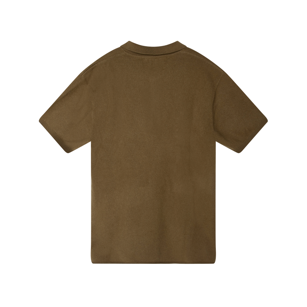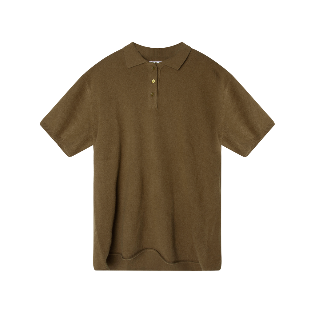 extreme cashmere No. 126 Lezard Green Polo Shirt features stretch cashmere, point collar, buttoned placket, and raw hem.