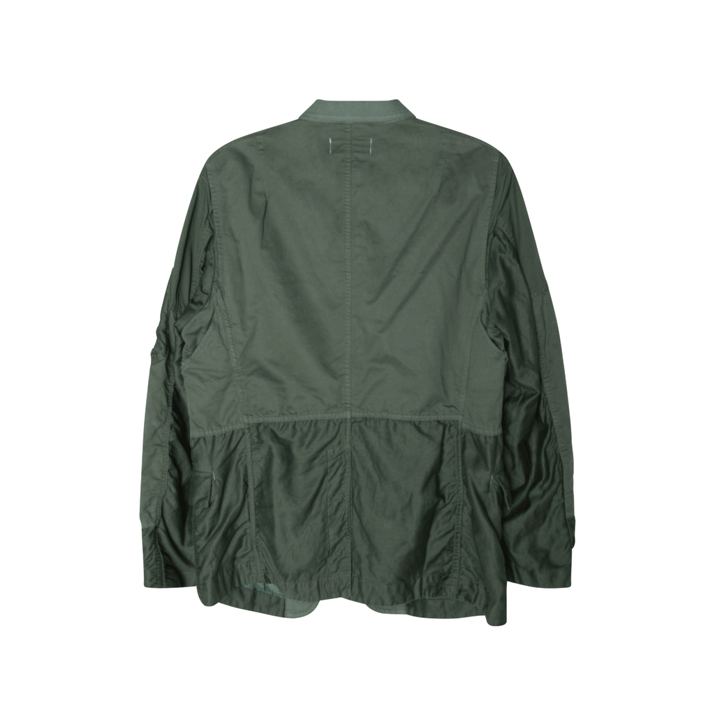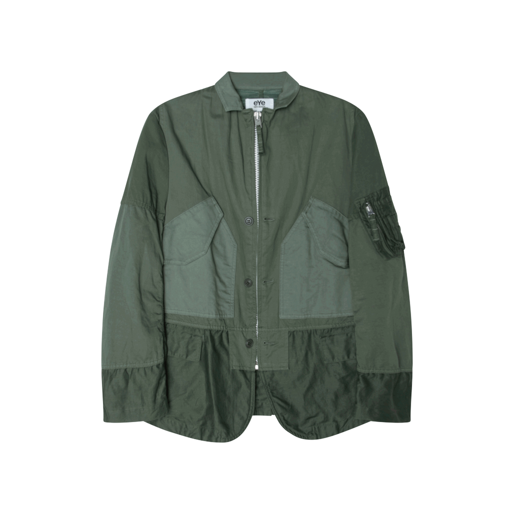 eYe Junya Watanabe Comme des Garcons Man Green Utility Jacket features front zip closure, 2 slanted chest pockets, 2 side pockets, 1 sleeve pocket, and back vent.
