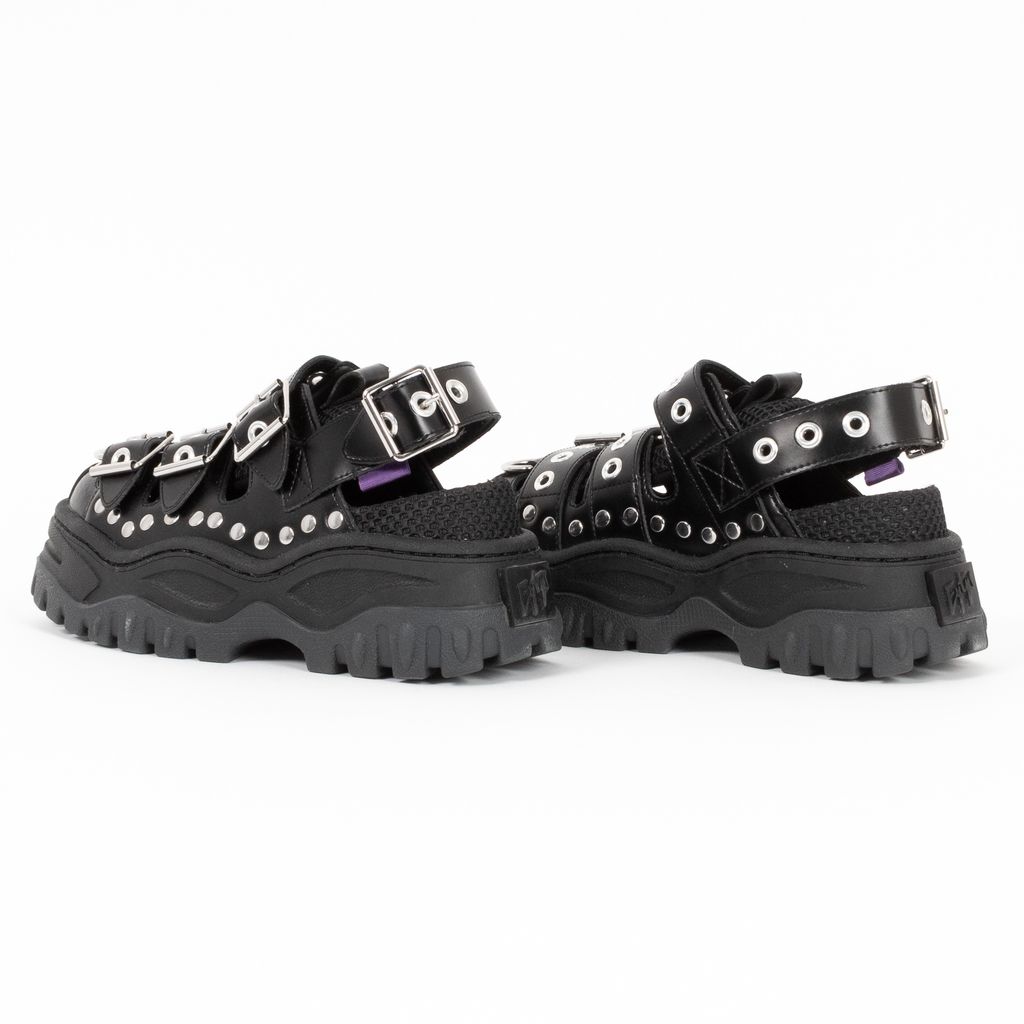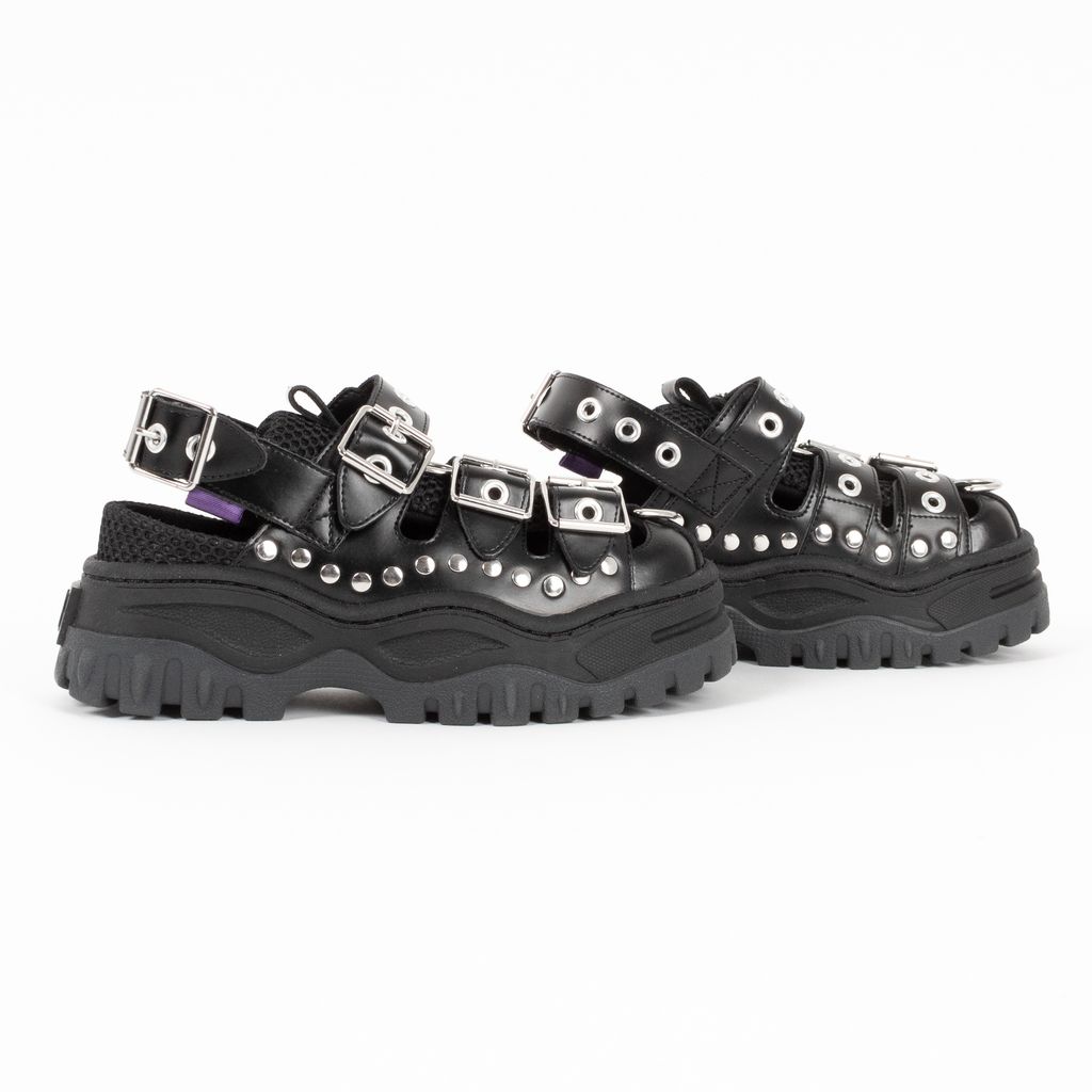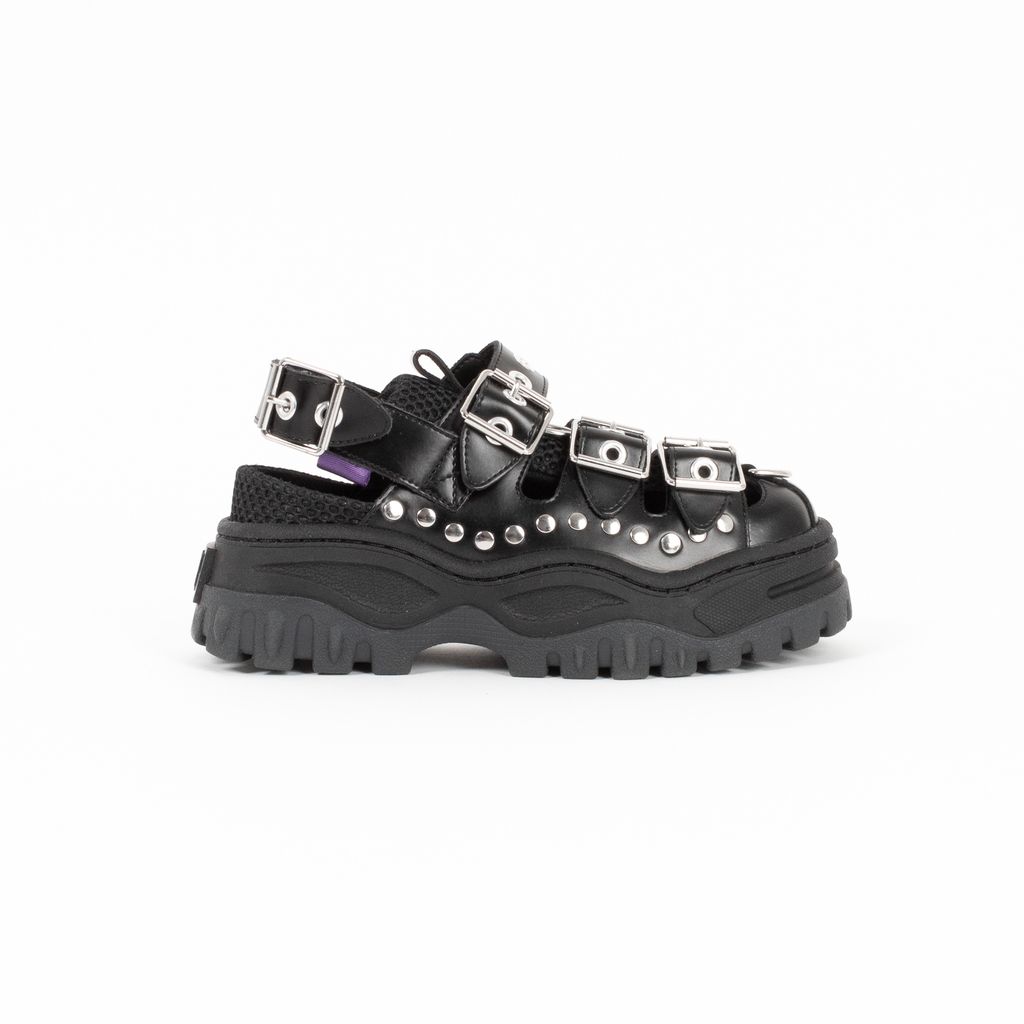 Nineties underground fashion sees the spotlight in the form of these insane sandal sneaker hybrid shoes from Eytys. Features thick, platform Buffalo-esque sole, adjustable leather straps with silver hardware, padded mesh underbody with pull tab at tongue, and leather insole.
