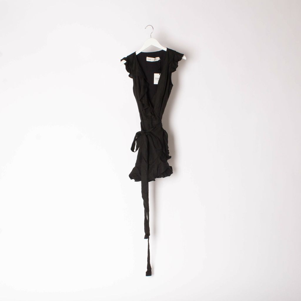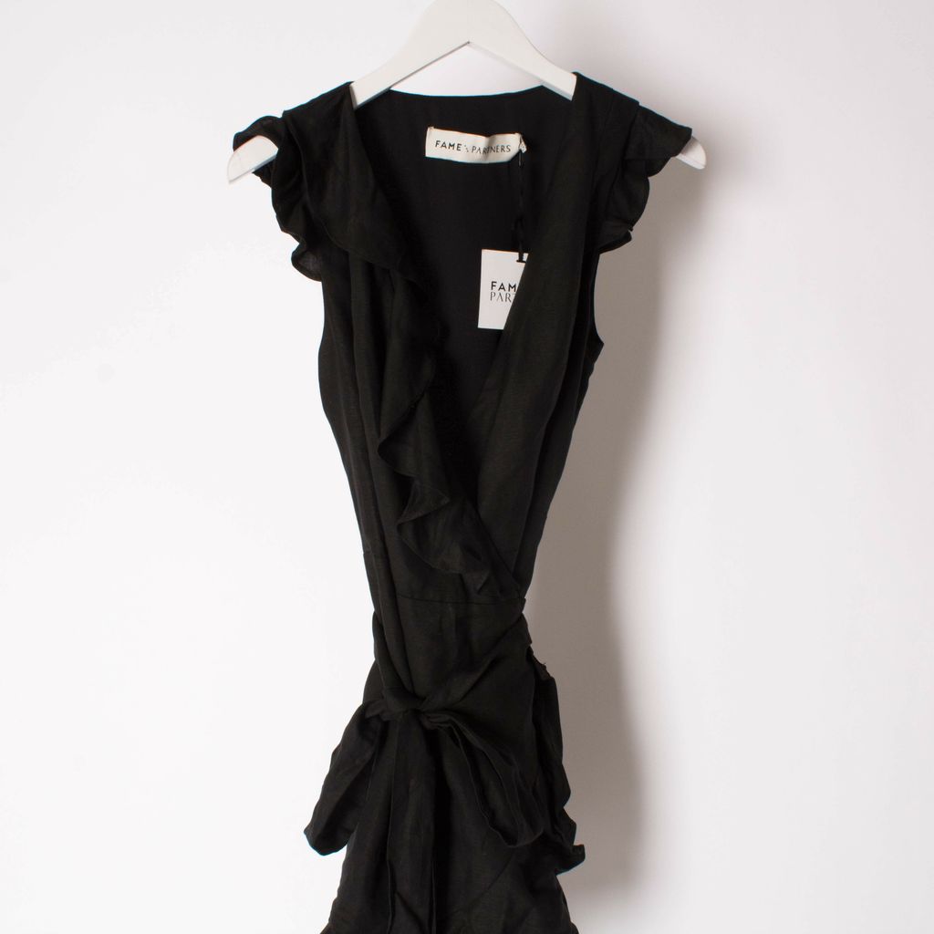 Fame and Partners "Tiffany" mini dress in linen. V neckline; ruffle trim. Flutter cap sleeves. Wrap silhouette. Self-tie waistline. Mini length. Ruffle hem.