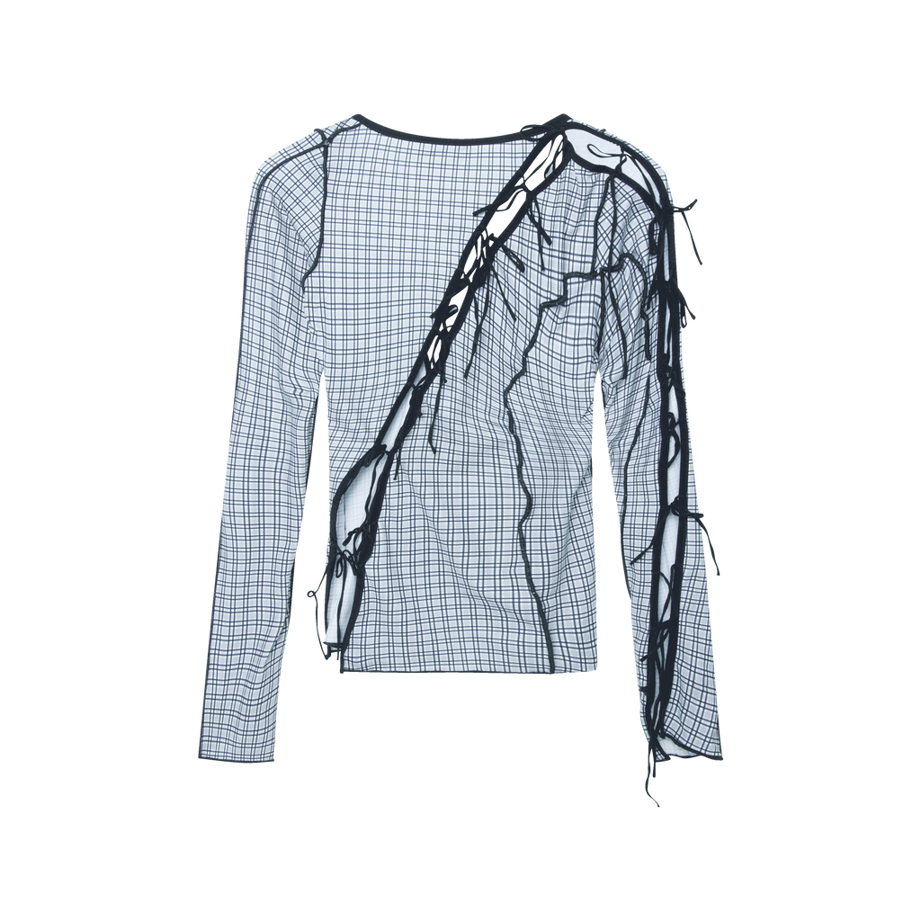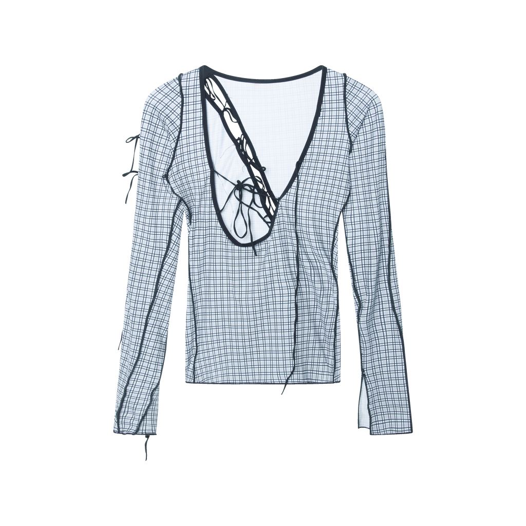 Fancì Club Plaid Cut Out Long Sleeve features black and grey plaid pattern, black exposed seams, cut out tie design on front and sleeve, and low back.