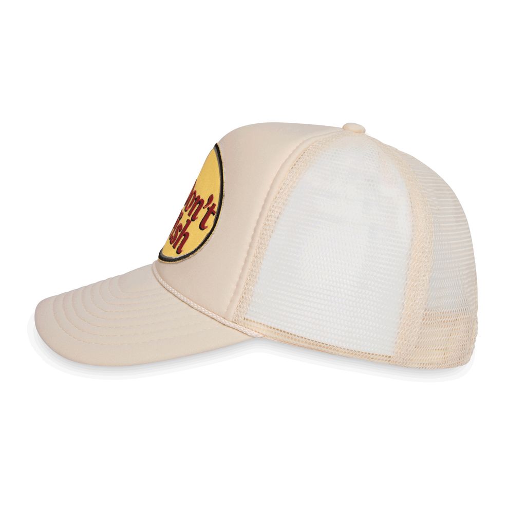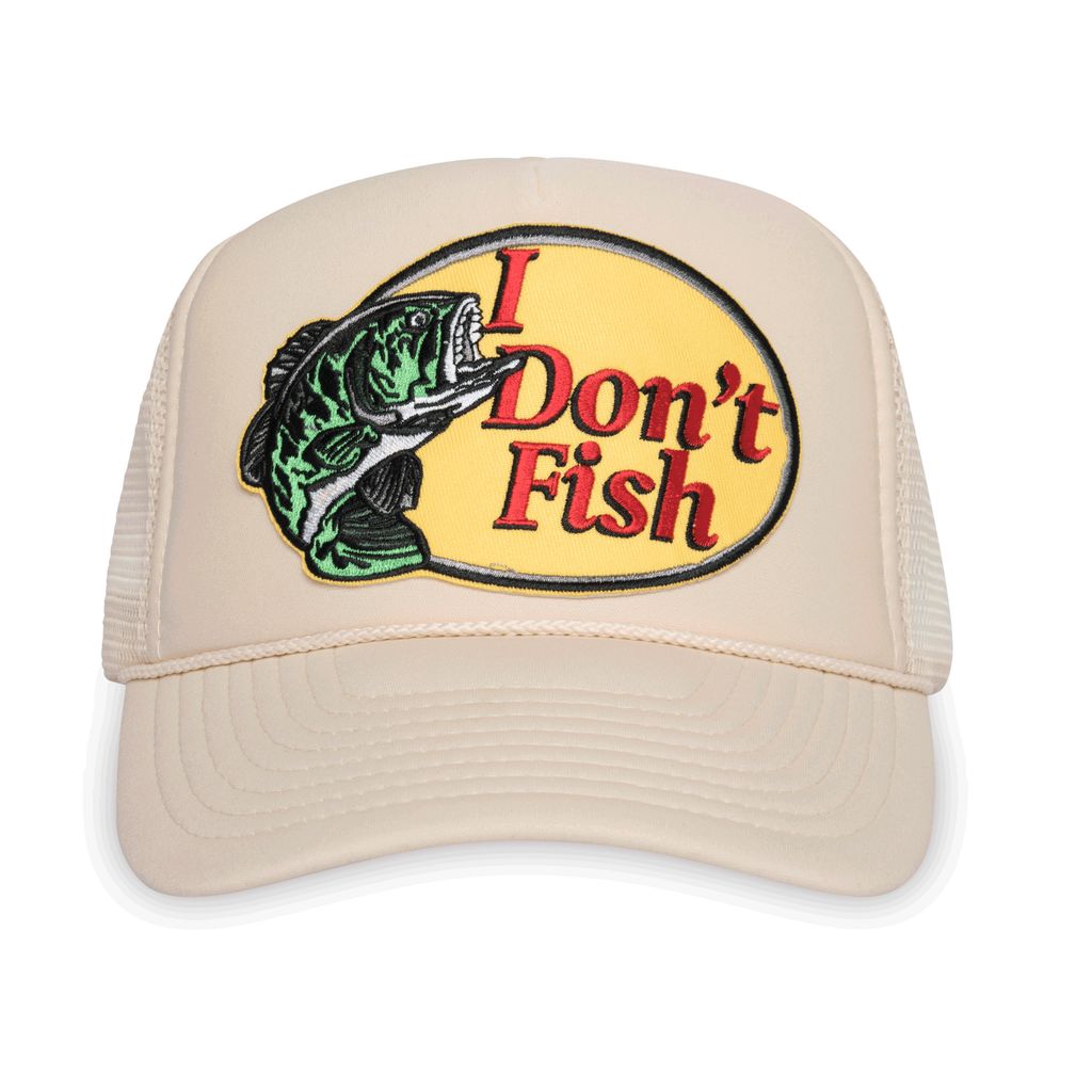 Father Figure 'I Don't Fish' Hat features embroidered patch details, netted back, and sizing adjustment