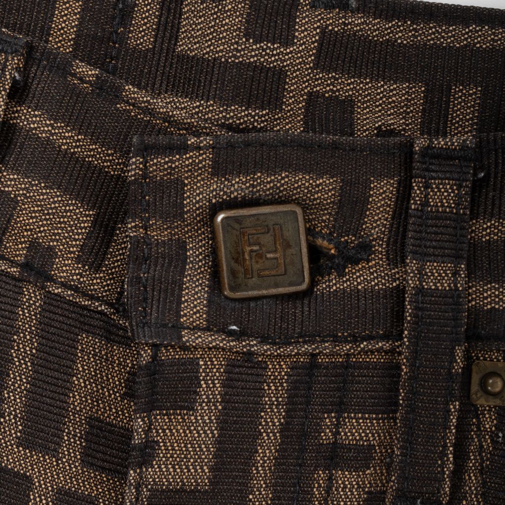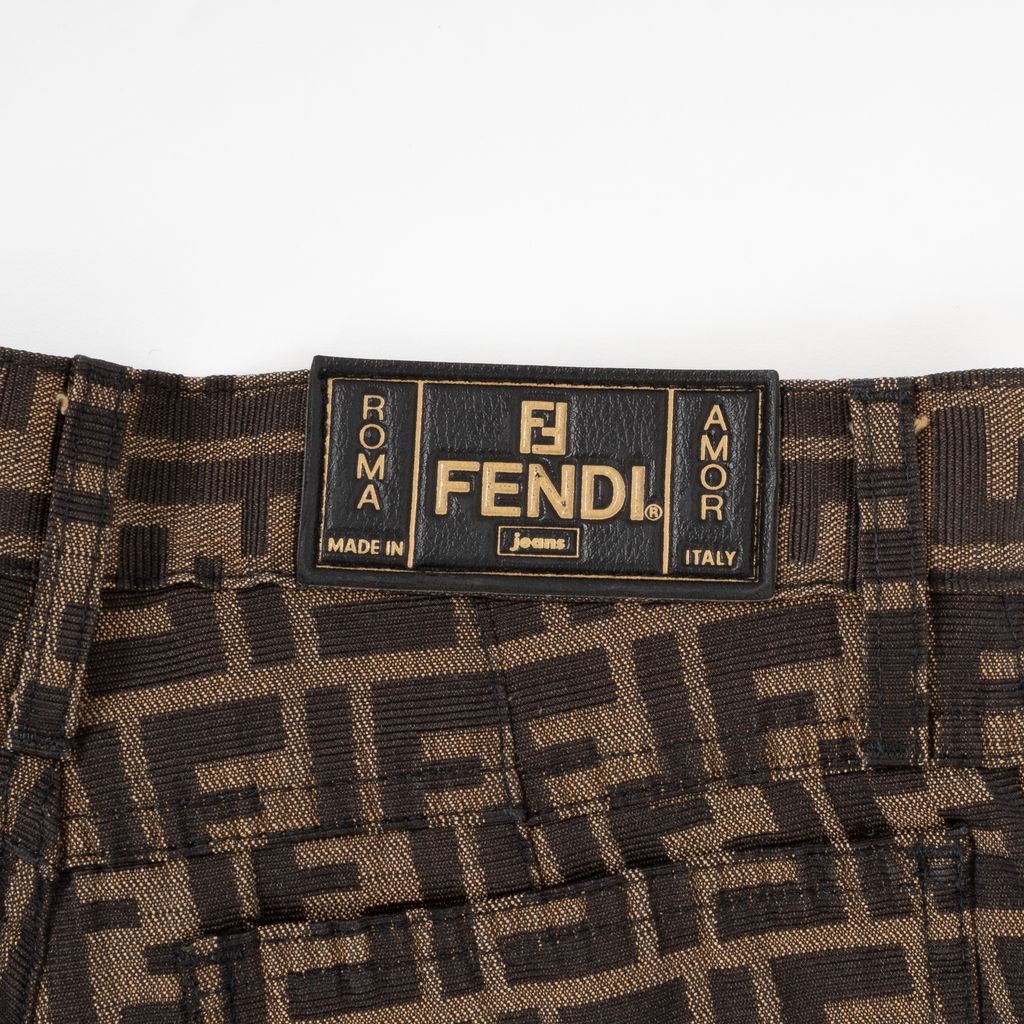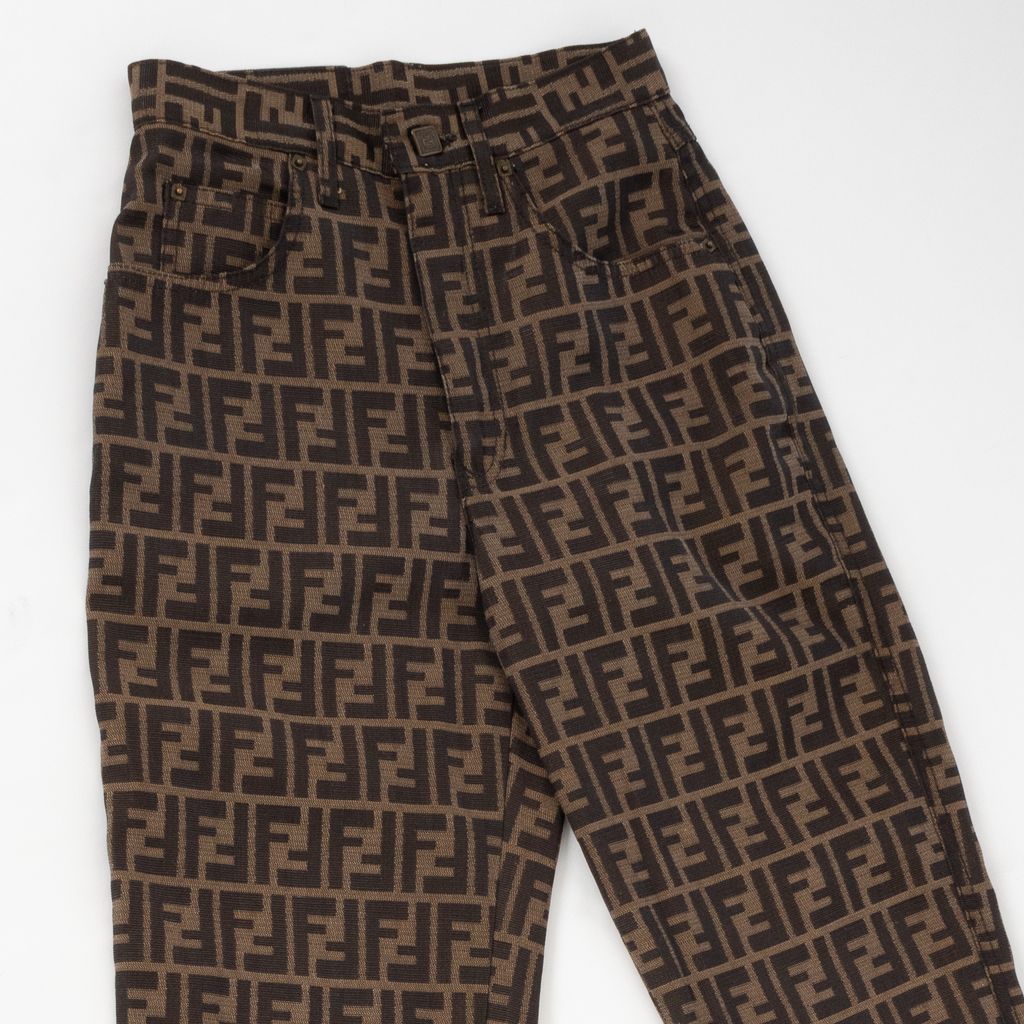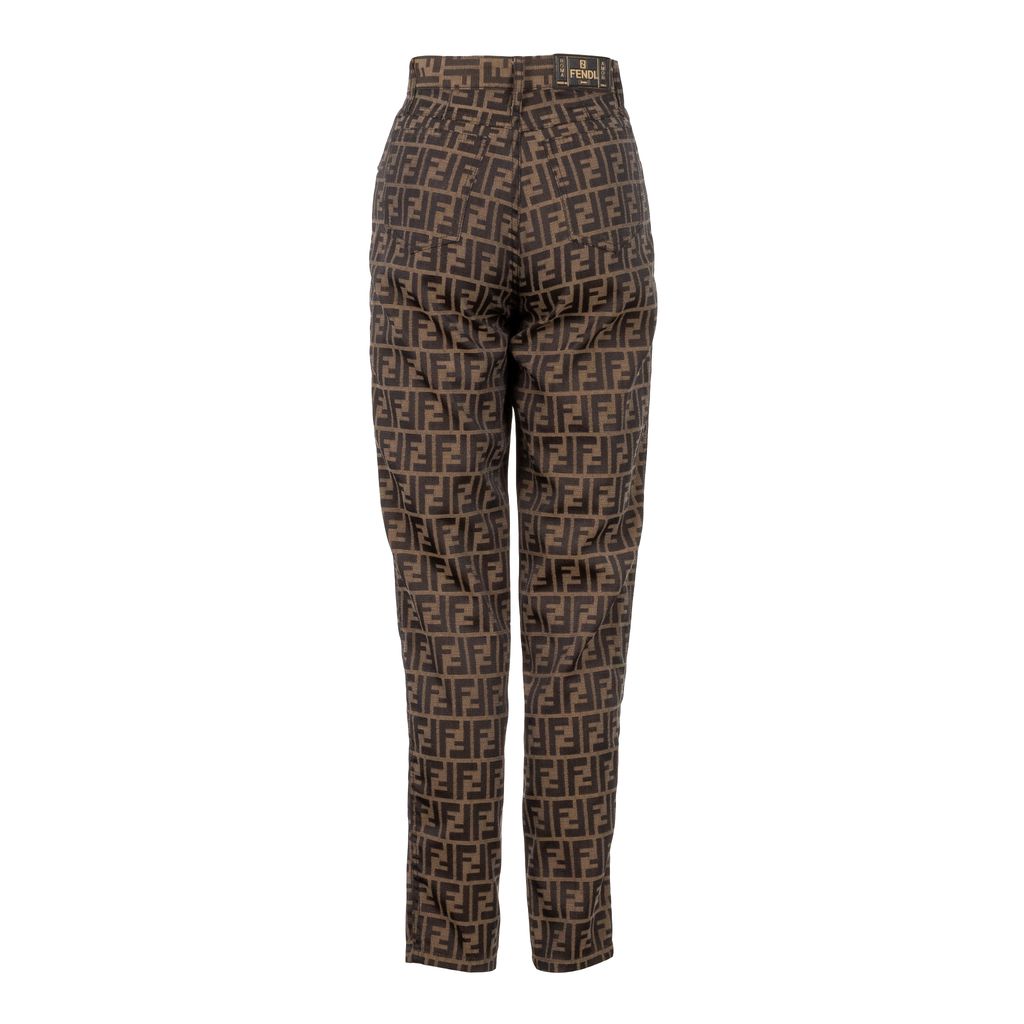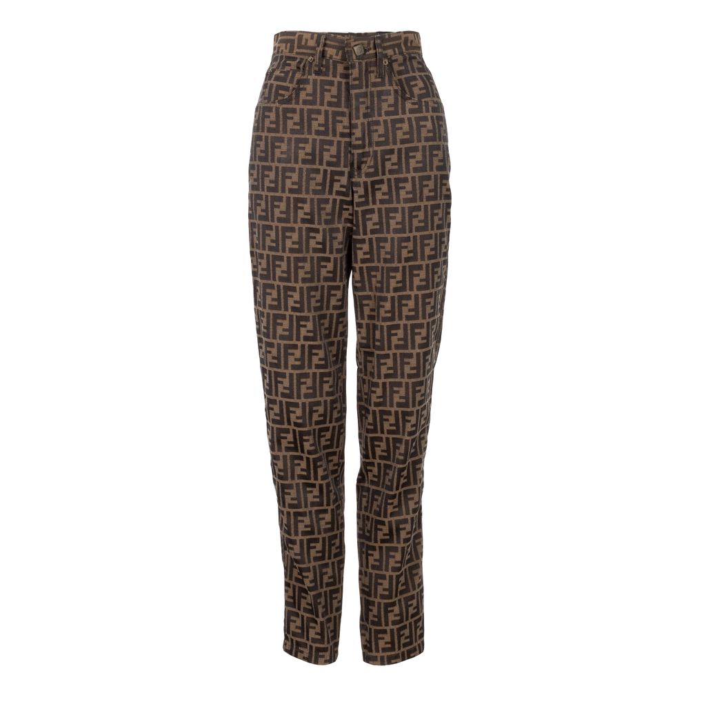 Beloved by the fashion masses, these high rise pants from Fendi show off their iconic all over print. Features full double F print body, high rise and skinny leg silhouette, zip and Fendi logo embossed button closure at waist, and leather back patch.