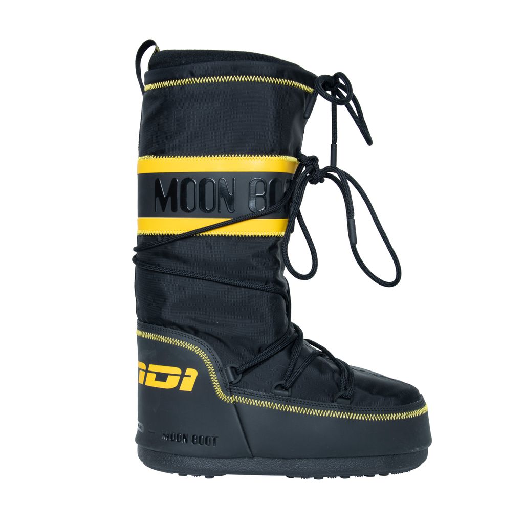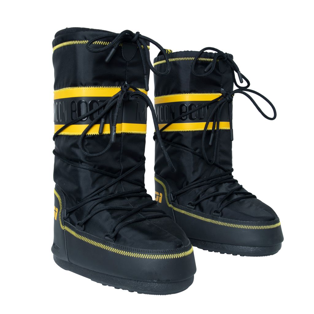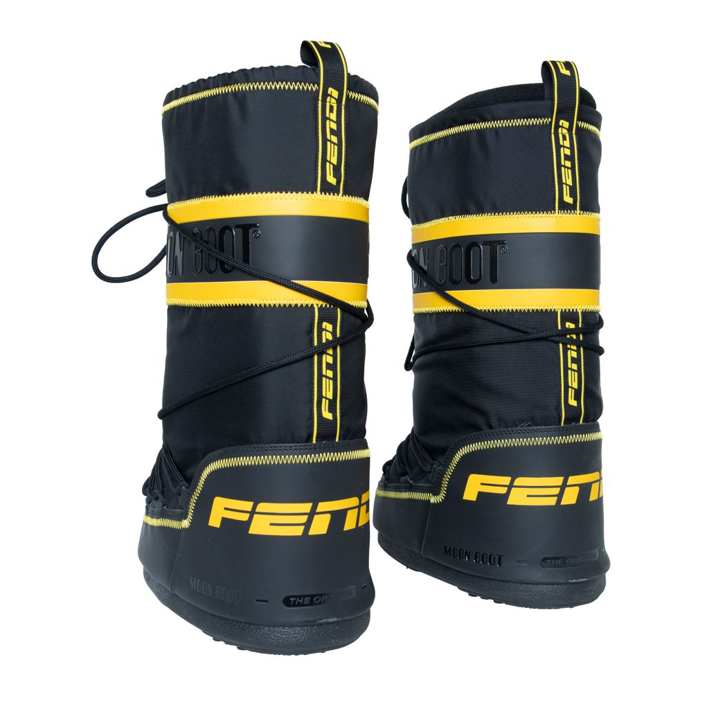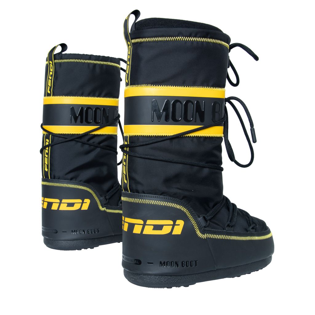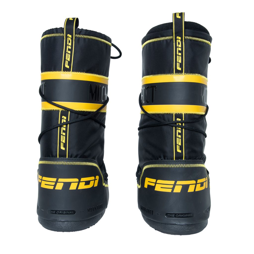 Fendi Black and Yellow Logo Striped Moon Boots features front lace-up fastening, logo print to the rear, pull tab at the heel, and flat rubber sole.