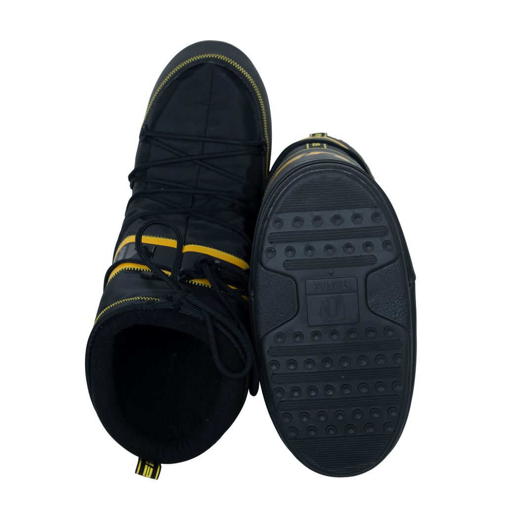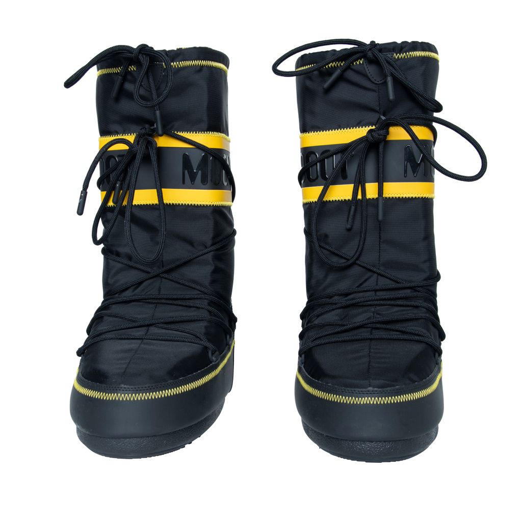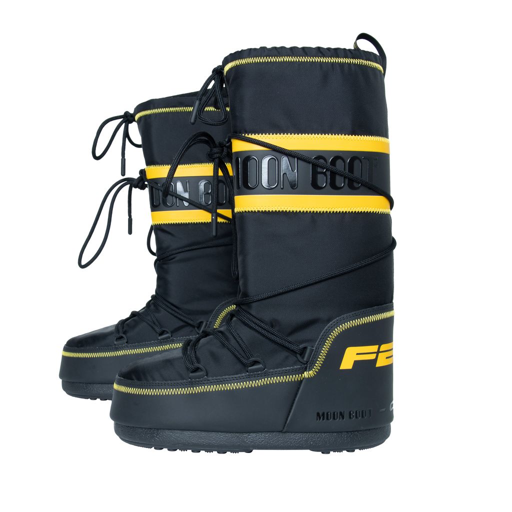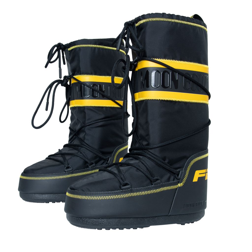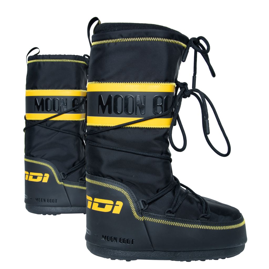 Fendi Black and Yellow Logo Striped Moon Boots features front lace-up fastening, logo print to the rear, pull tab at the heel, and flat rubber sole.
