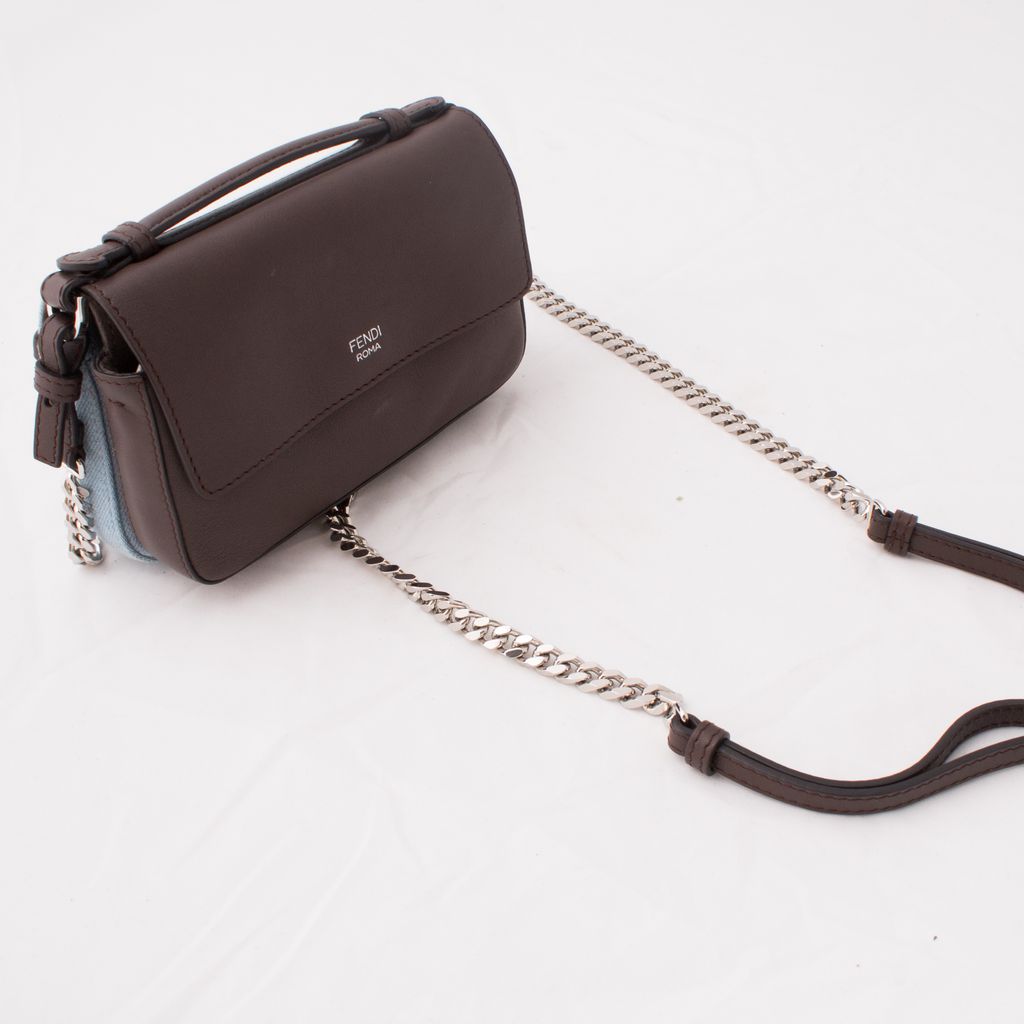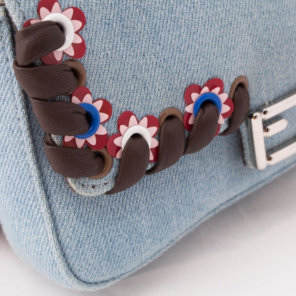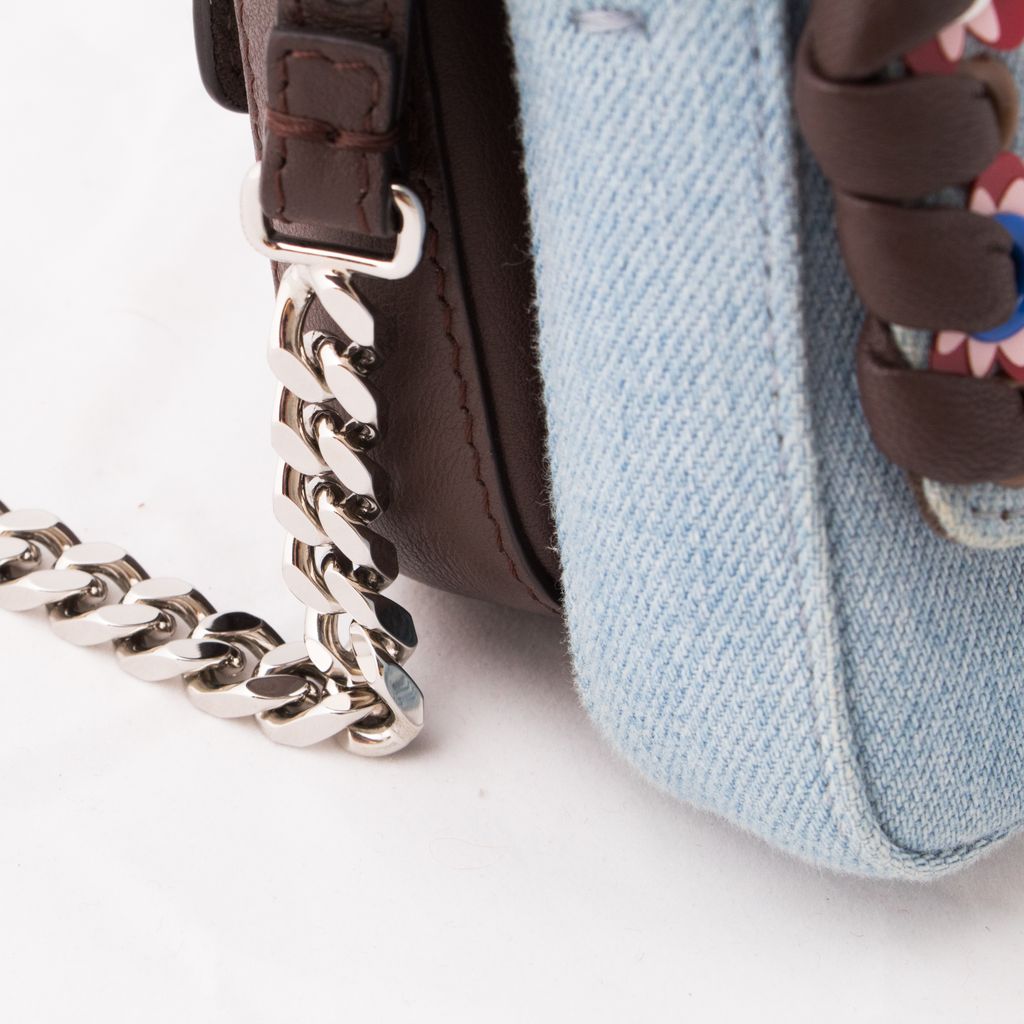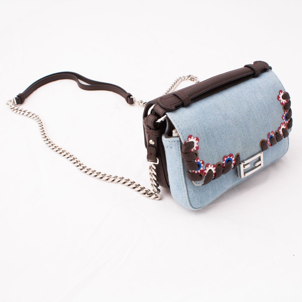 Like new bag consisting of 2 micro Baguette-shaped compartments, the first in brown leather and the second in light blue denim, decorated with red flowers. Flap with press stud and FF buckle on both of the compartments. Interior with 2 card slots and flat pockets. Removable chain shoulder strap and palladium-finish accessories. No visible blemishes, and protective covers on closures still in place. - Condition