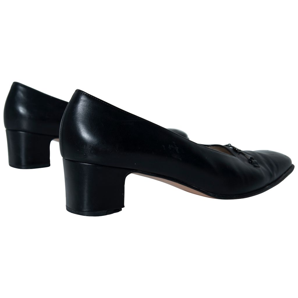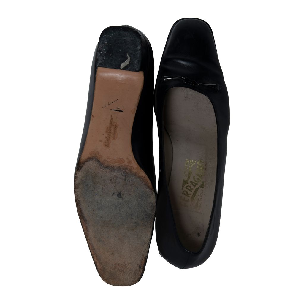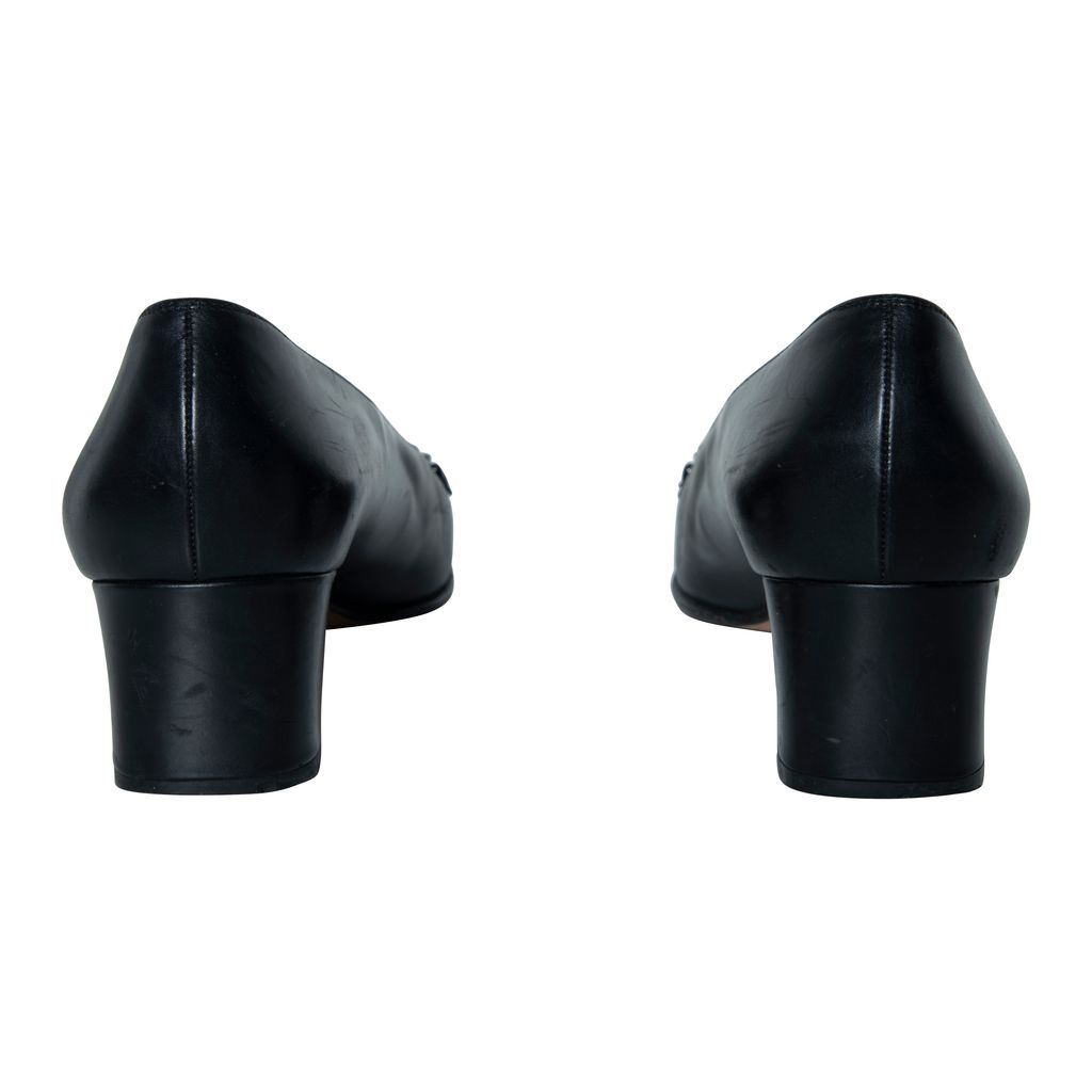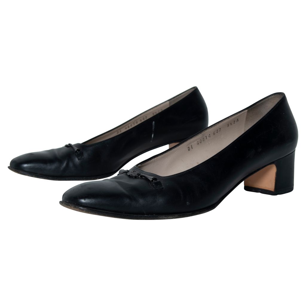 Ferragamo Black Leather Pumps features block heel and black hardware on vamp.