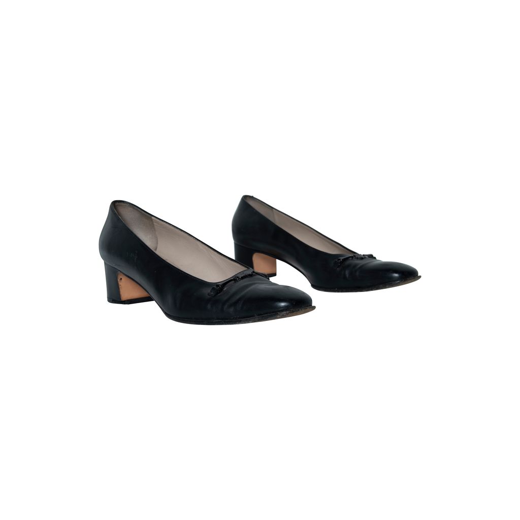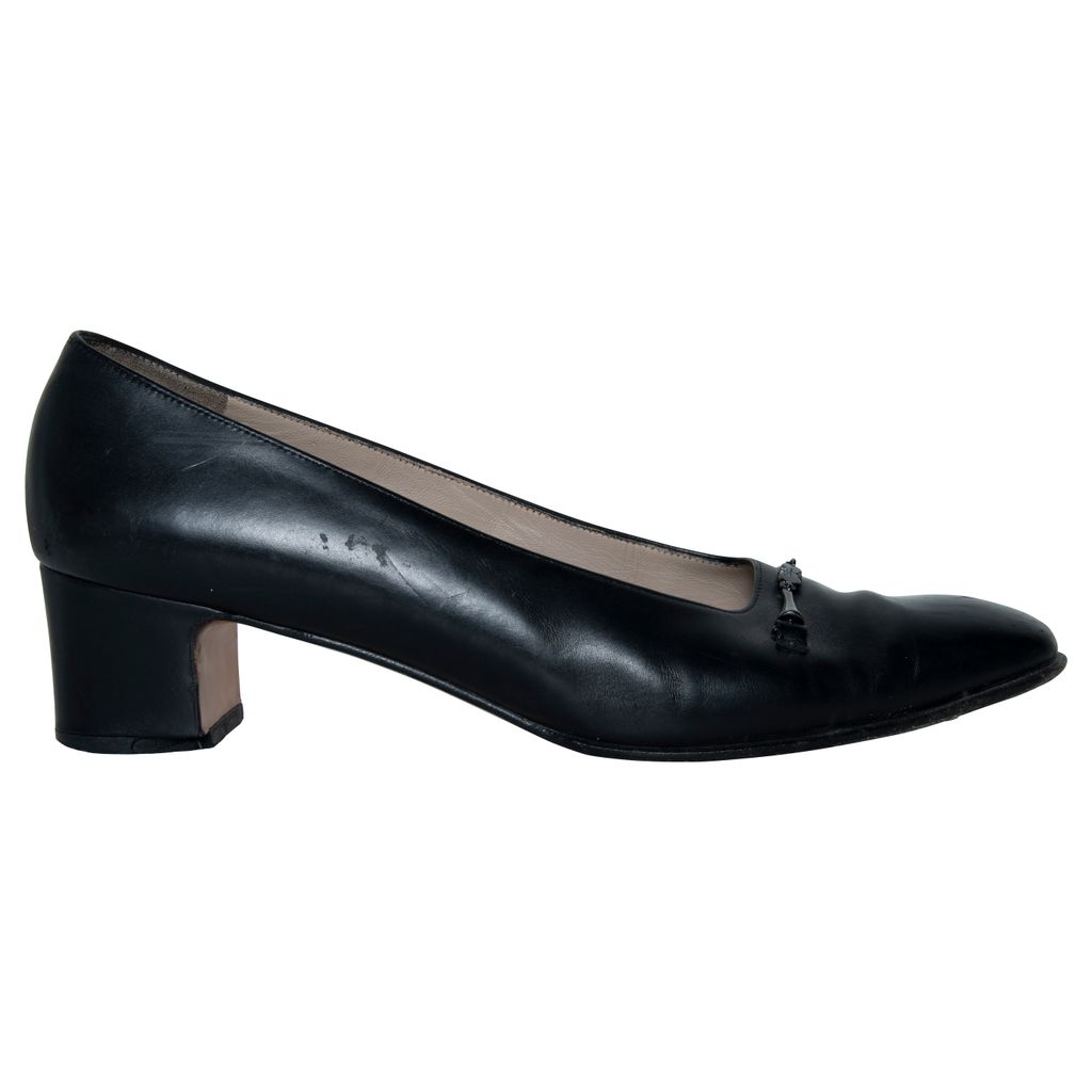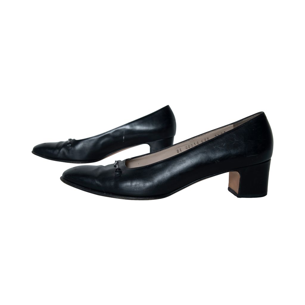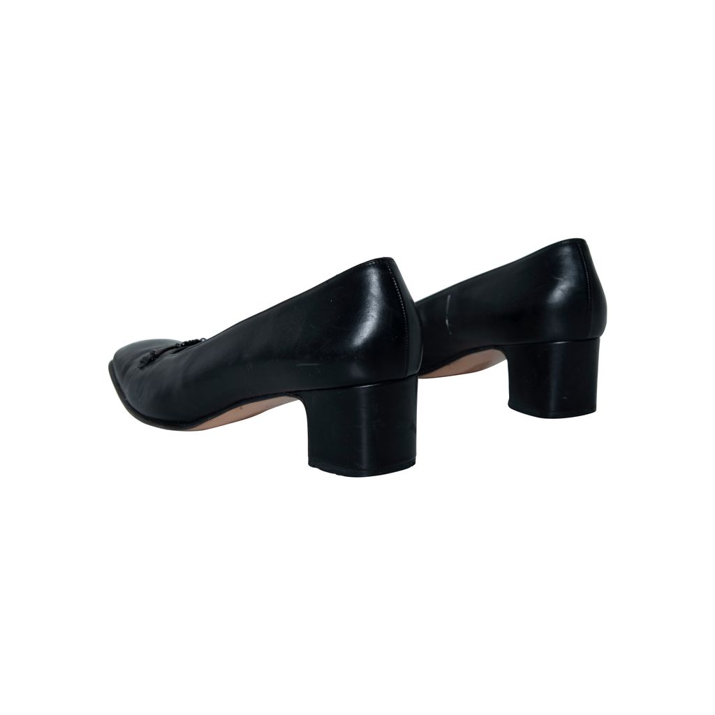 Ferragamo Black Leather Pumps features block heel and black hardware on vamp.