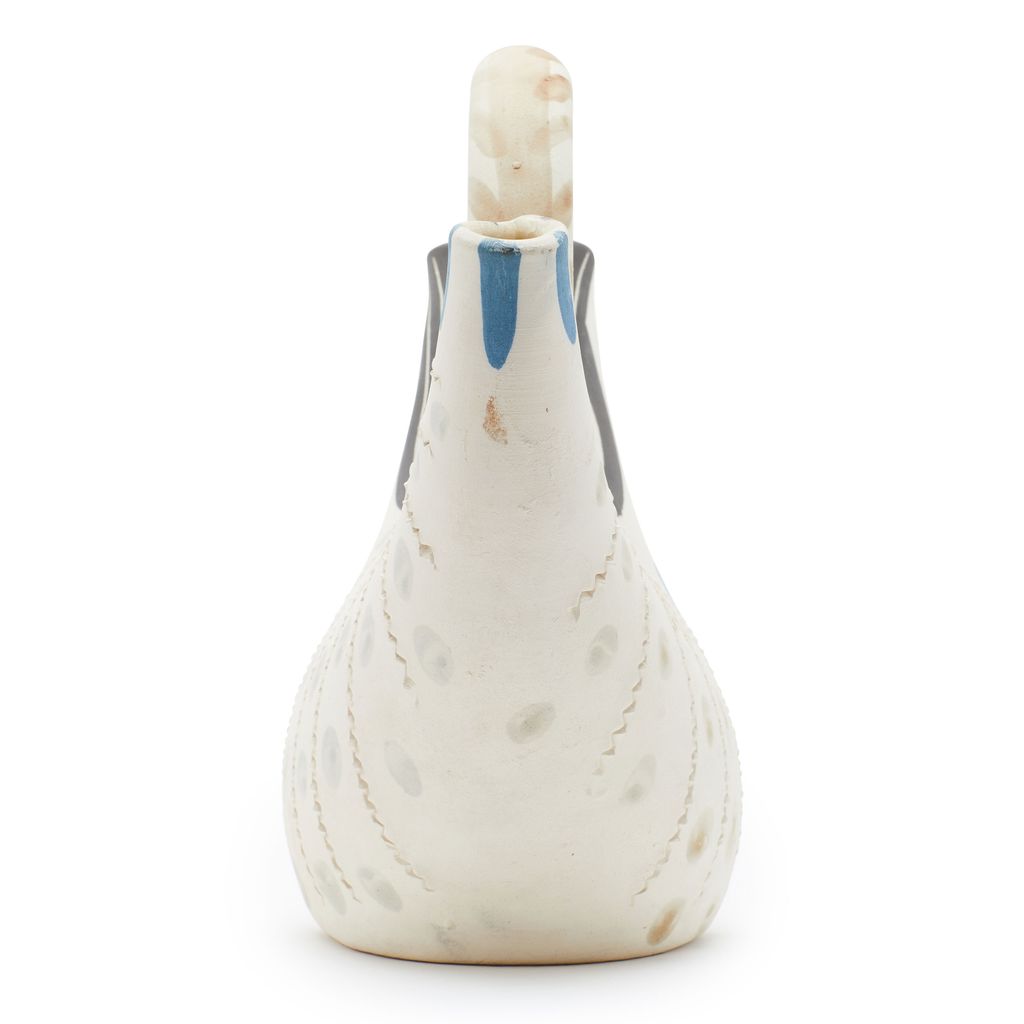 White earthenware ceramic vessel, partially engraved, with coloured engobe and glaze.