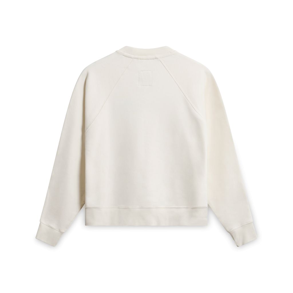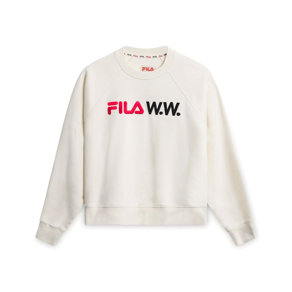 FILA partnered with Wood Wood for a tennis-inspired capsule. This cream-colored sweatshirt marries the two brands with their starkly colored logos embroidered on the front. Features wide-band elasticized hem and a boxy, relaxed fit.