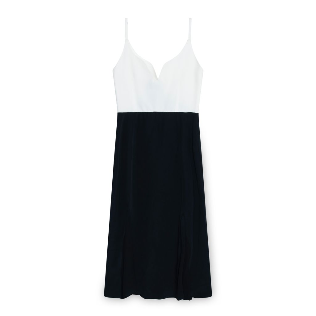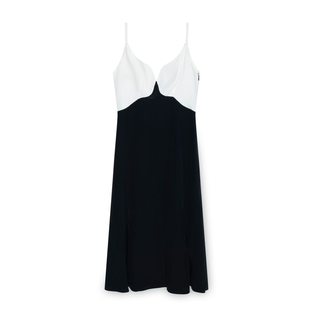 Filiarmi Black and White Midi Dress features spaghetti straps, side zipper, and ruffled hem.