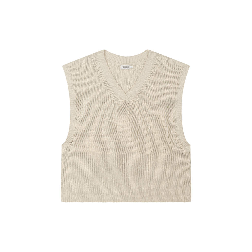 Filippa K Ivory Nancy Ribbed Knit Vest features V-neck, ribbed knit, and sleeveless design.