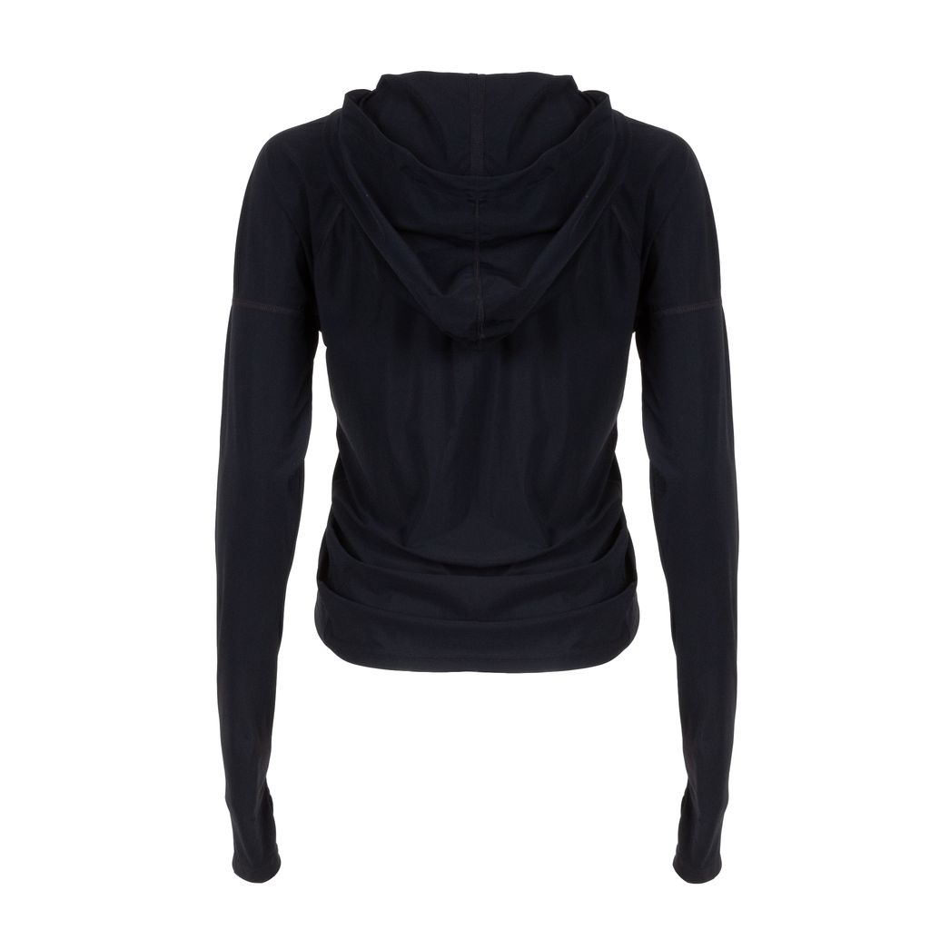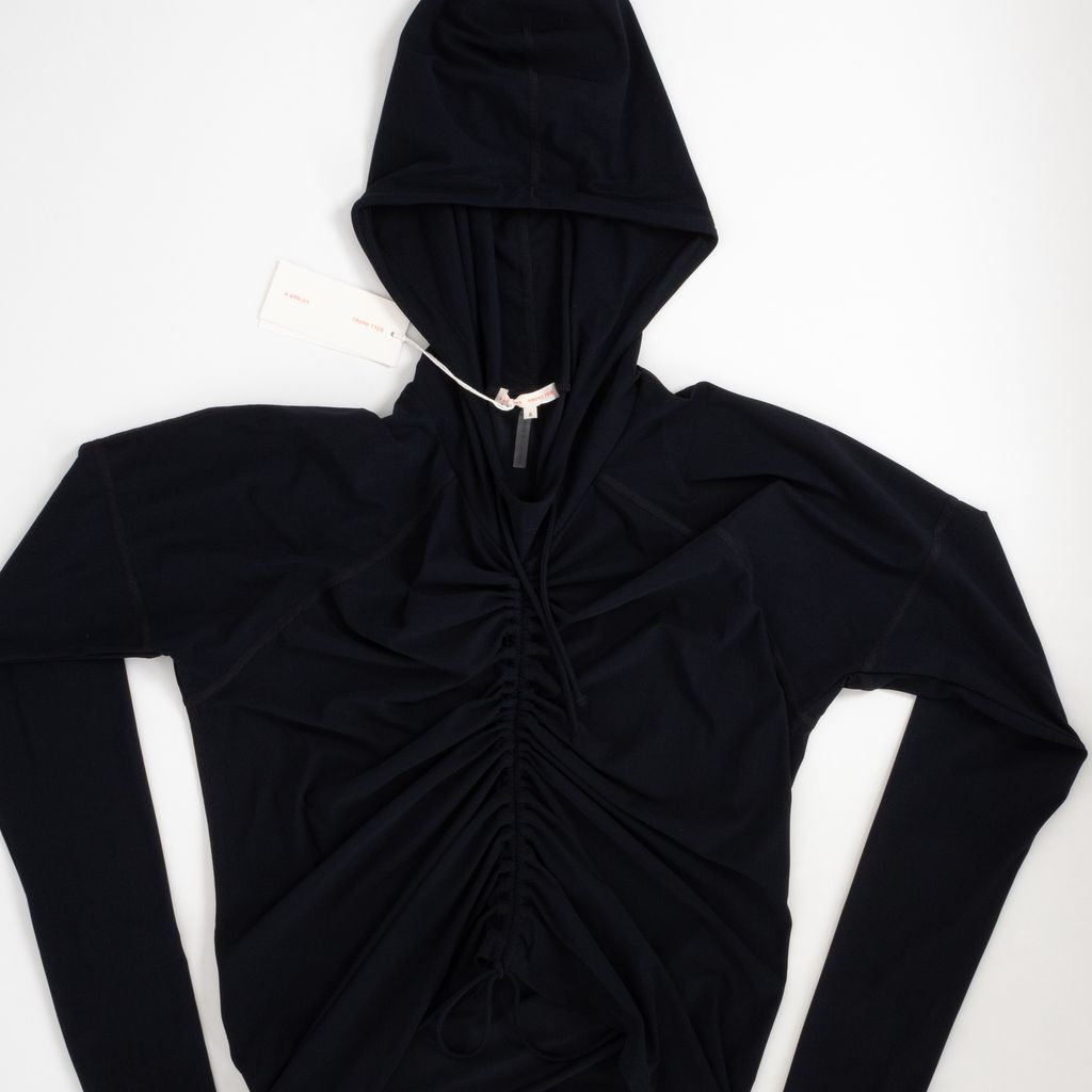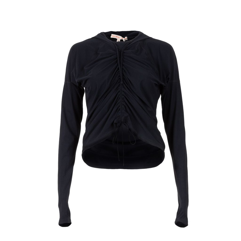 Get workout ready in this ultra soft, long sleeve top from Swedish brand Filippa K. Features full hood, ruched front with adjustable pull ties, and long sleeves with drop shoulder.