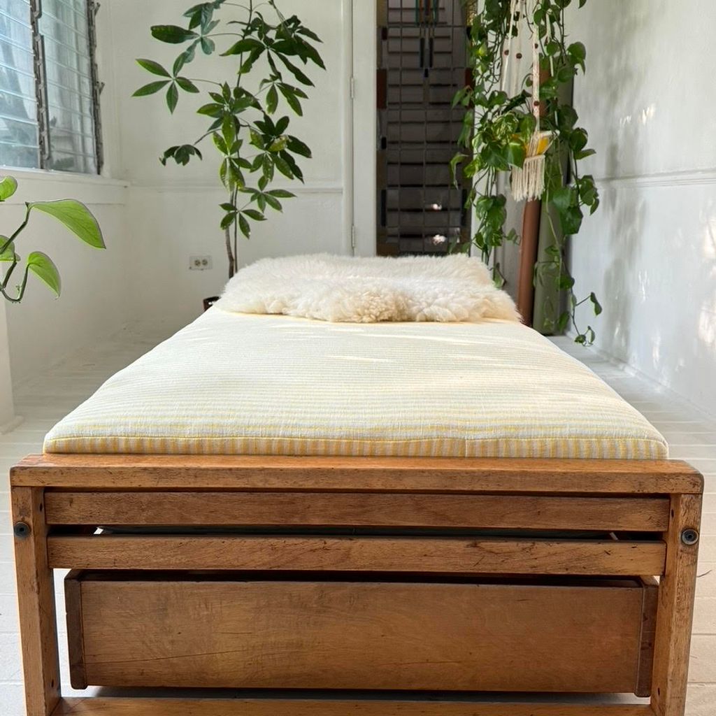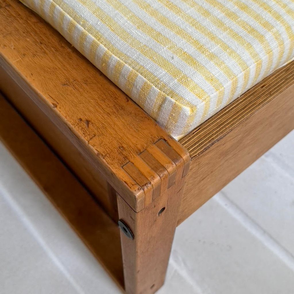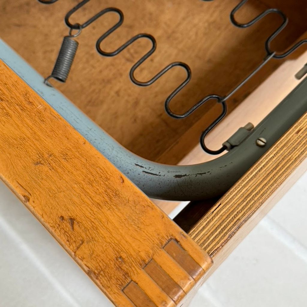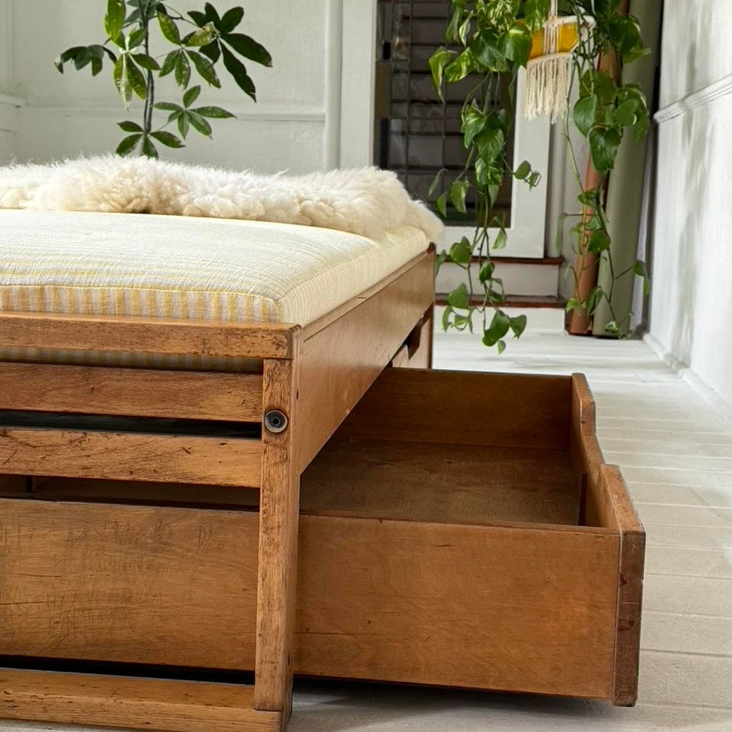 A superbly simple Finnish birch single bed with trundle like storage and a single red lacquered rail.