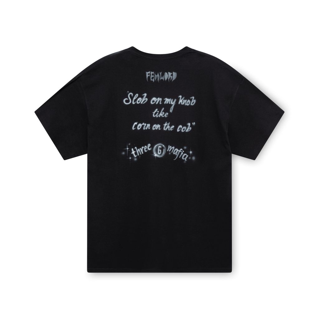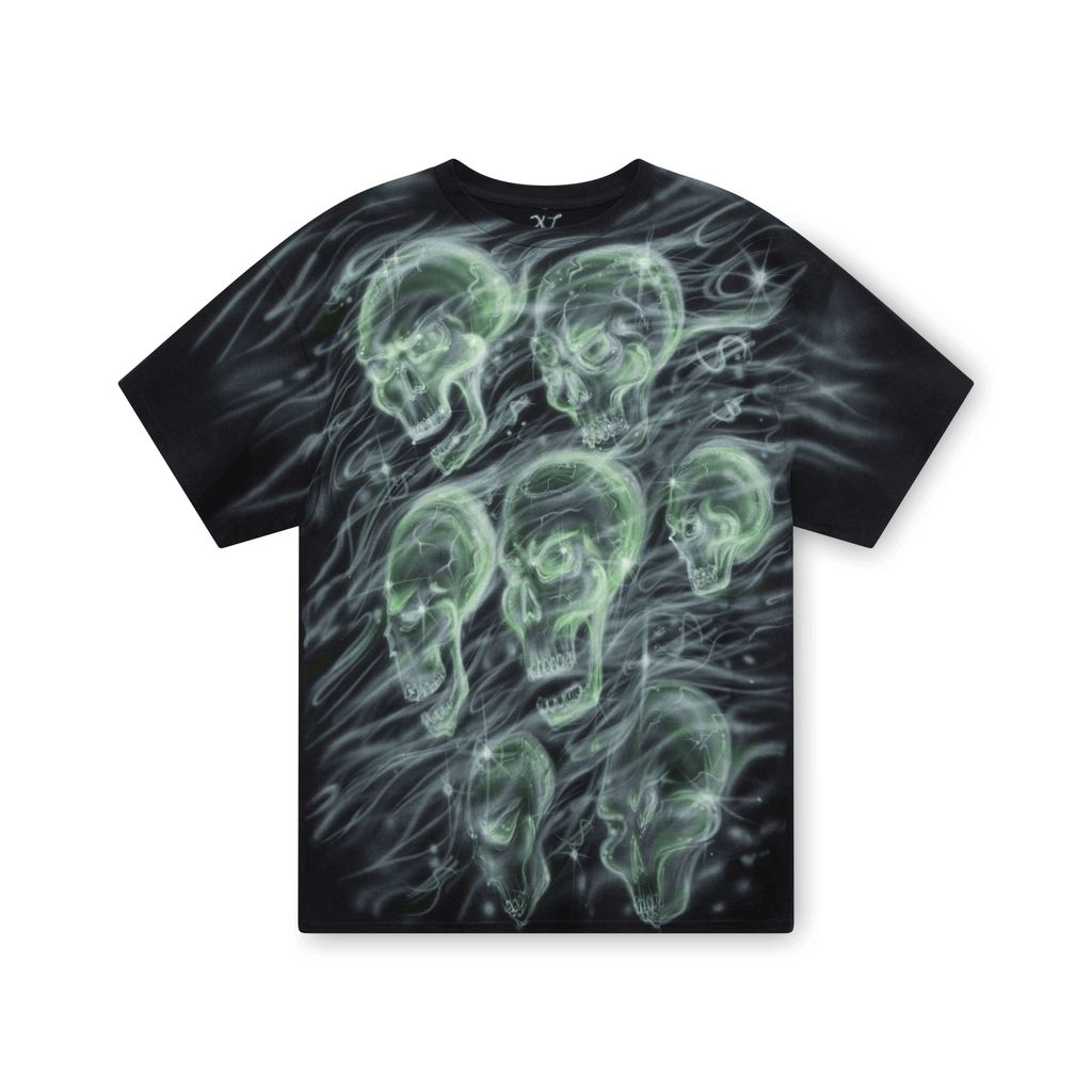 'Fire Skull' Airbrushed Tee features green and white airbrushed skulls on front and Three 6 Mafia lyrics on back