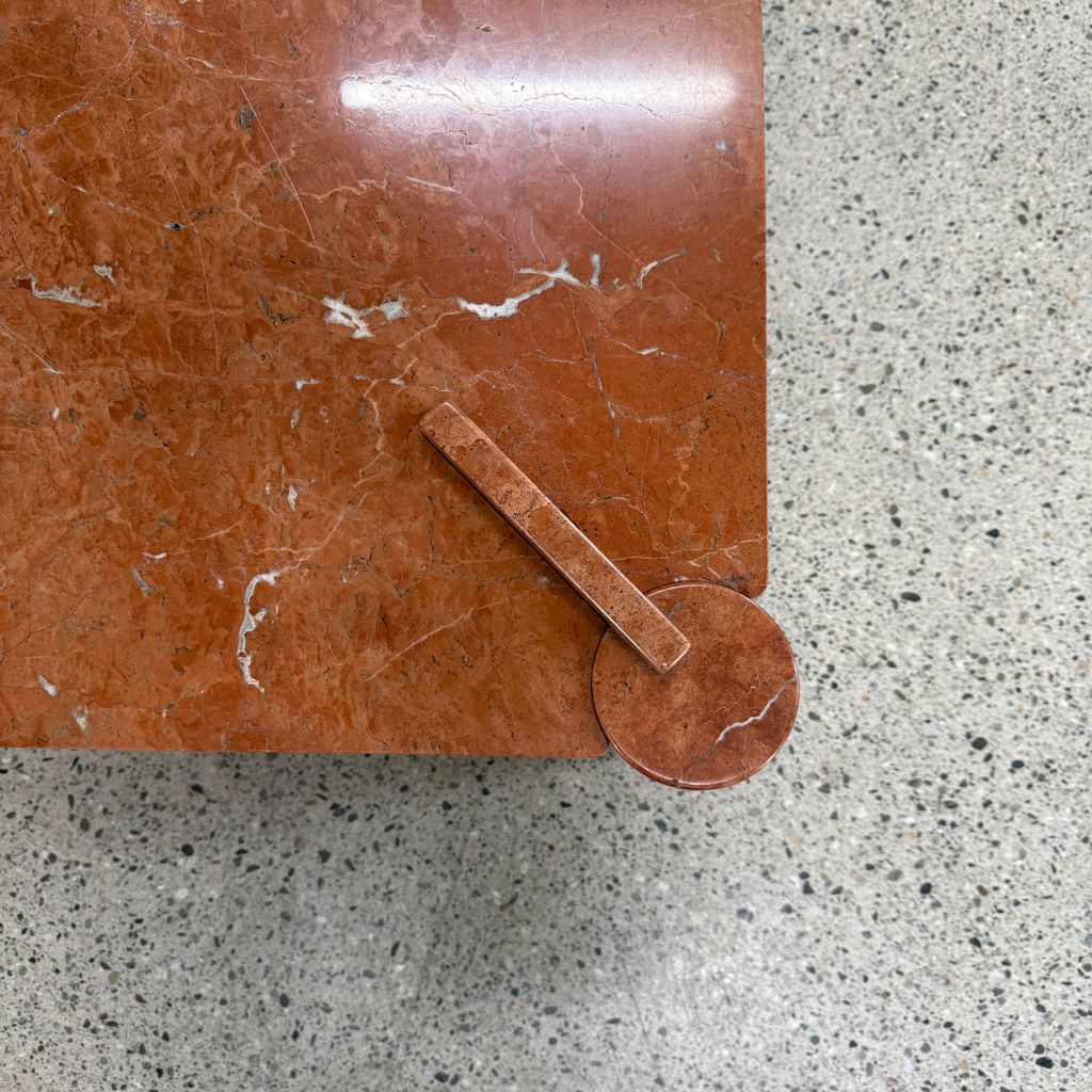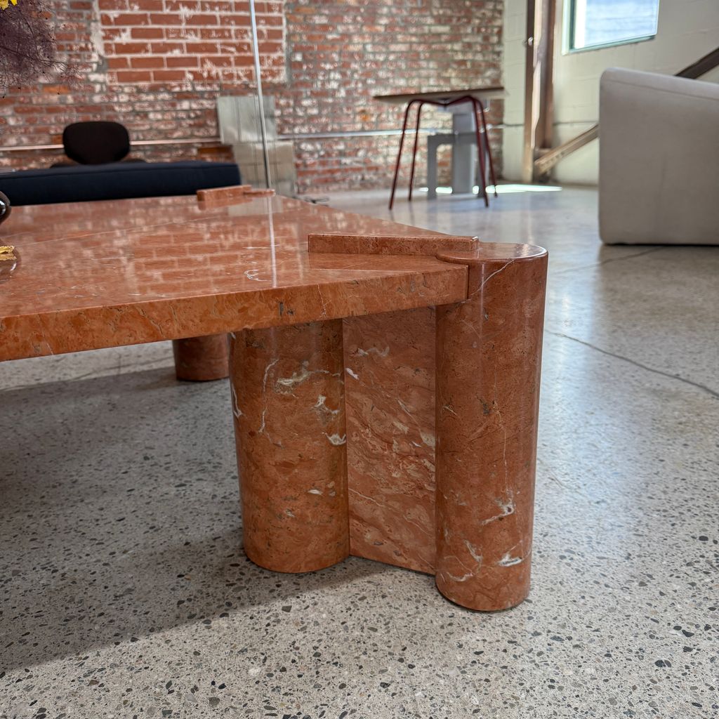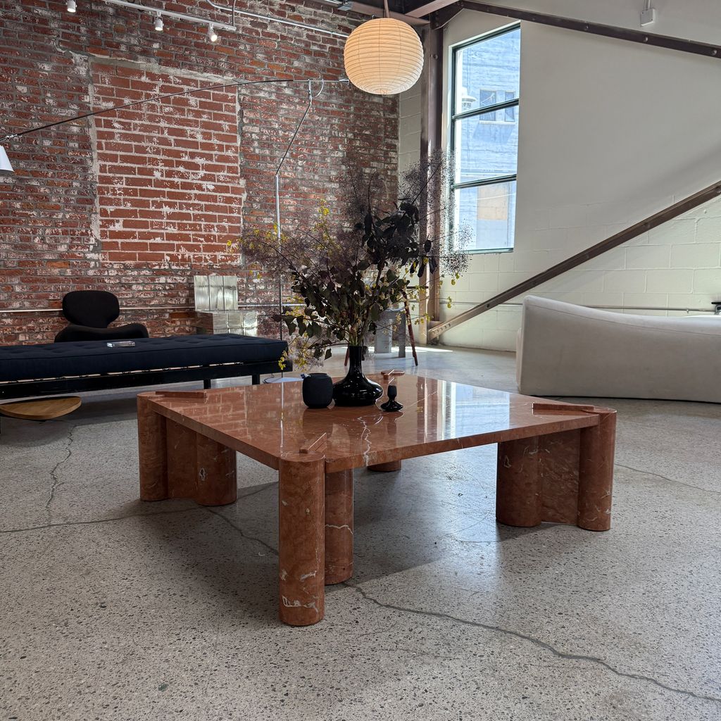 Marble top and sculpted column legs. Weighing nearly 450 pounds, the design originated in Italy's Neo-Liberty movement in the late 1950s.