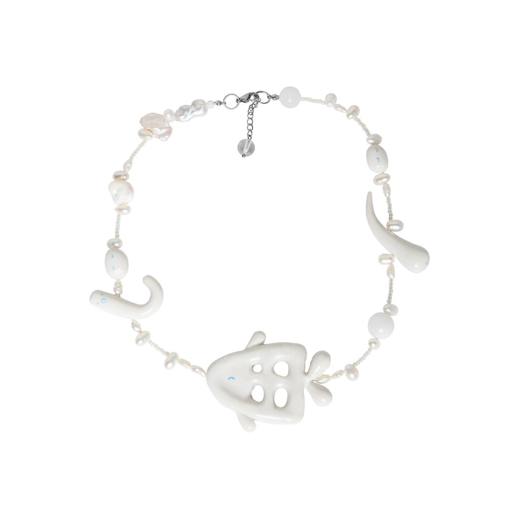 This fish is sleeping so that you don't have to sleep. Every time you go out and you are tired, wear this fish necklace and you will feel so awake again. Because fish is sleeping for you. Who else will care for you like this fish? They will always have your back. This necklace is made with glass beads, freshwater pearls, and stainless steel hardware. The pendant and several other beads are handmade with polymer clay and resin.