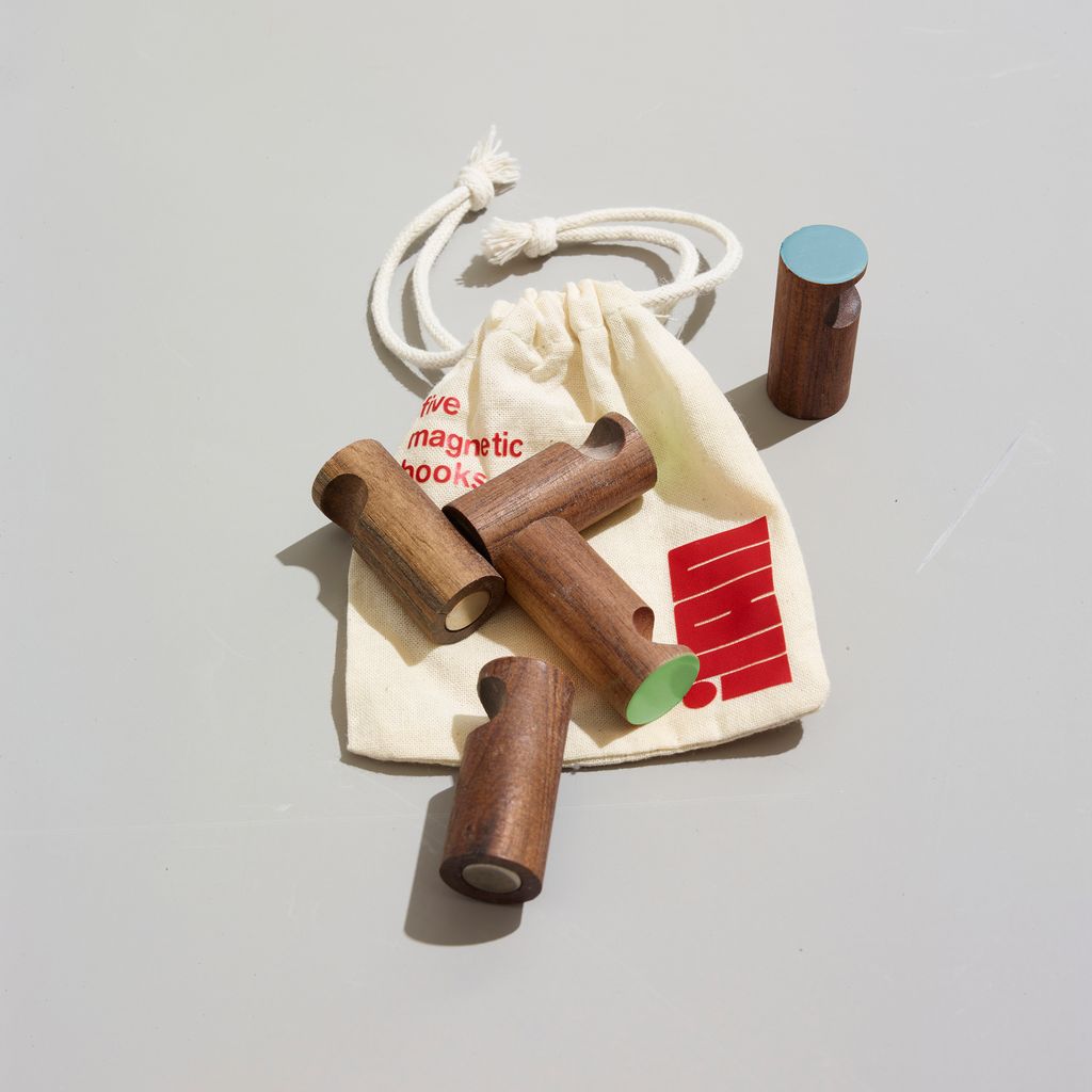 5 Magnetic Hooks. These multi-color hooks come in a convenient bag and are designed to stick to any metal surface. Perfect for hanging keys, holding notes, or displaying photographs, they offer both function and charm. A simple yet stylish addition to your entryway, each hook is crafted from walnut wood and hand-painted in vibrant colors, combining natural warmth with a modern touch.
