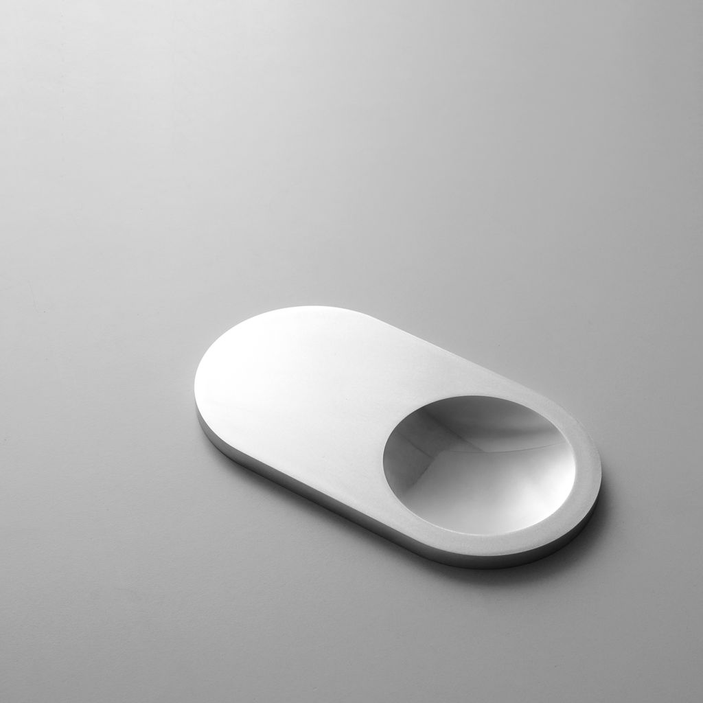The outer surface is brushed, while the inner circular mold is hand polished referring to the inner surface of a spoon, mirroring its surroundings in a slightly distorted way.
