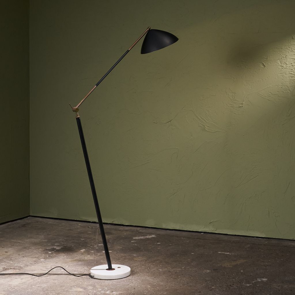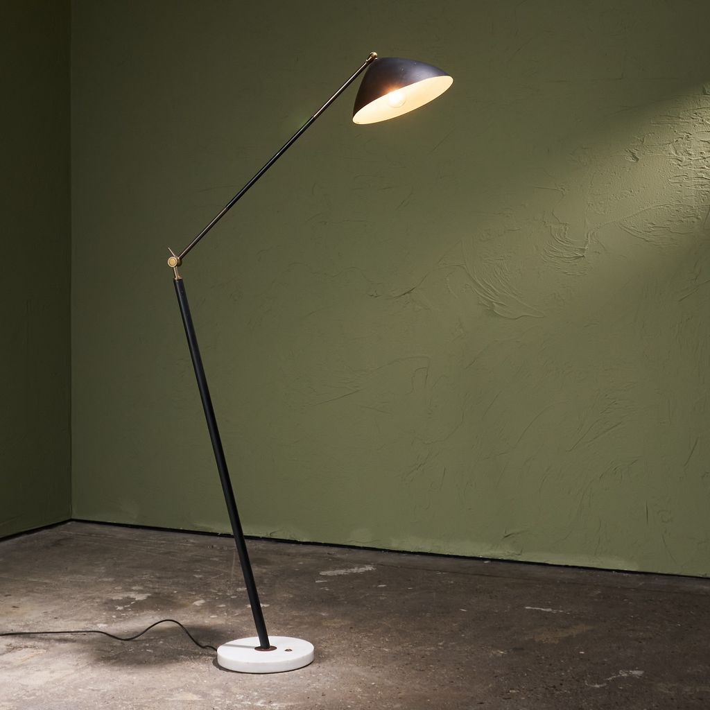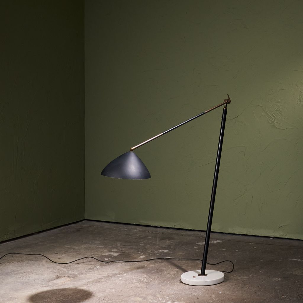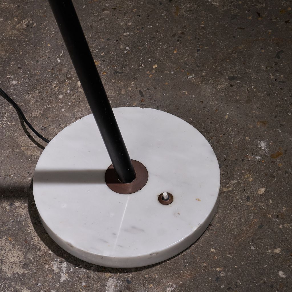 This Floor Lamp from the 1960s by Stilux Milano features base of marble supports a stem placed on a diagonal axis. This stem connects to a swivel made of brass, allowing rotation and controlled movement. From the joint, another stem extends and permits height changes through a system of positions. Each change engages the swivel structure. The upper end carries a shade in a round form. The construction demonstrates balance through geometry and motion. Material contrast appears through the meeting of stone and metal. The object shows design intent, mechanical clarity, and production focus.