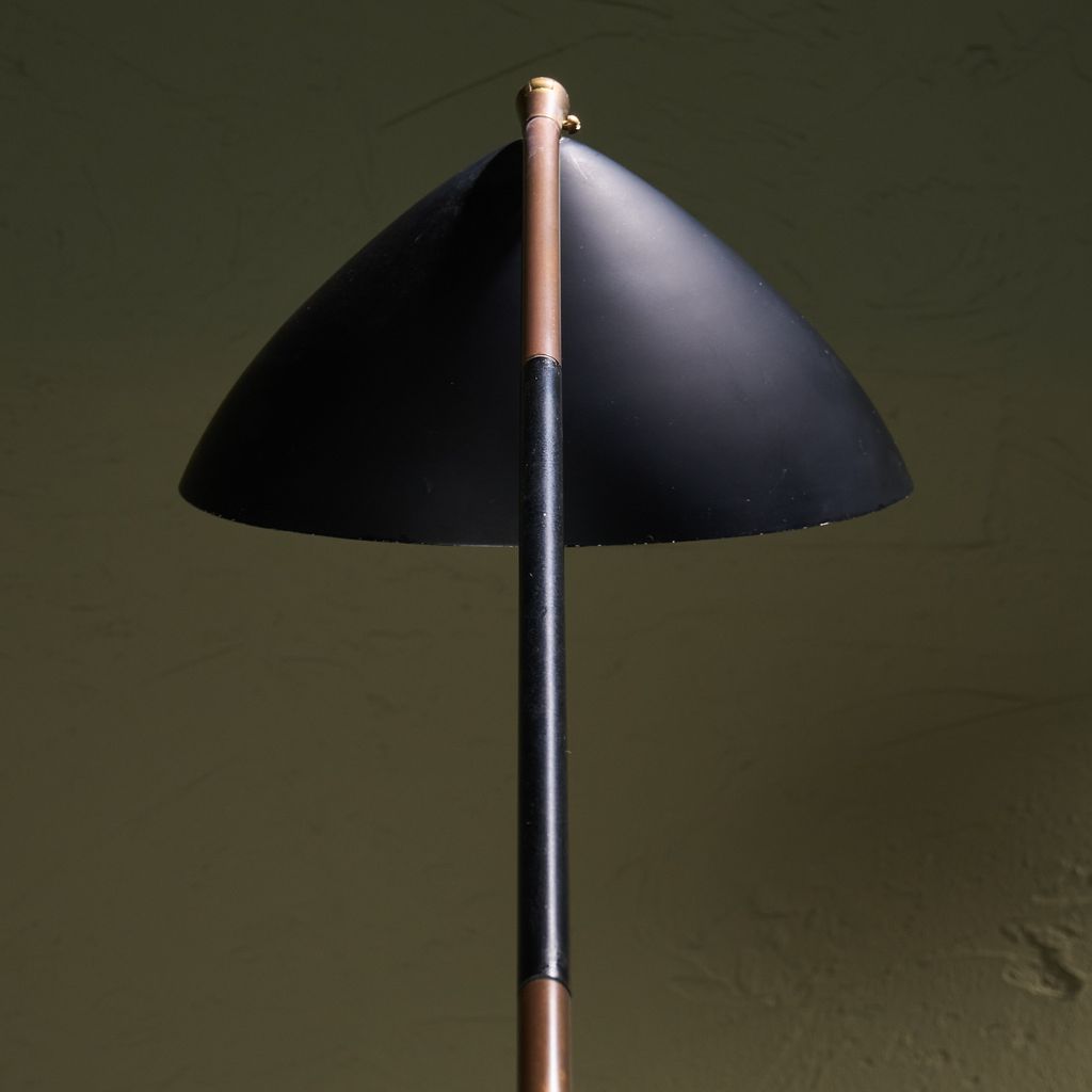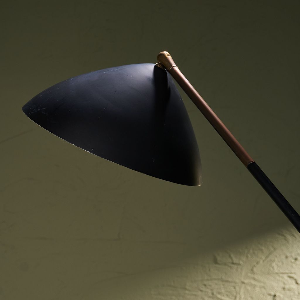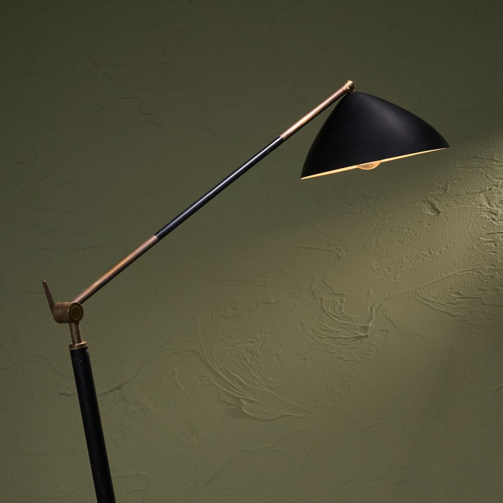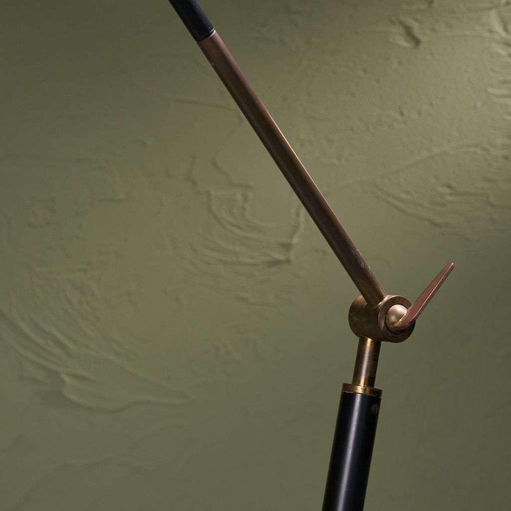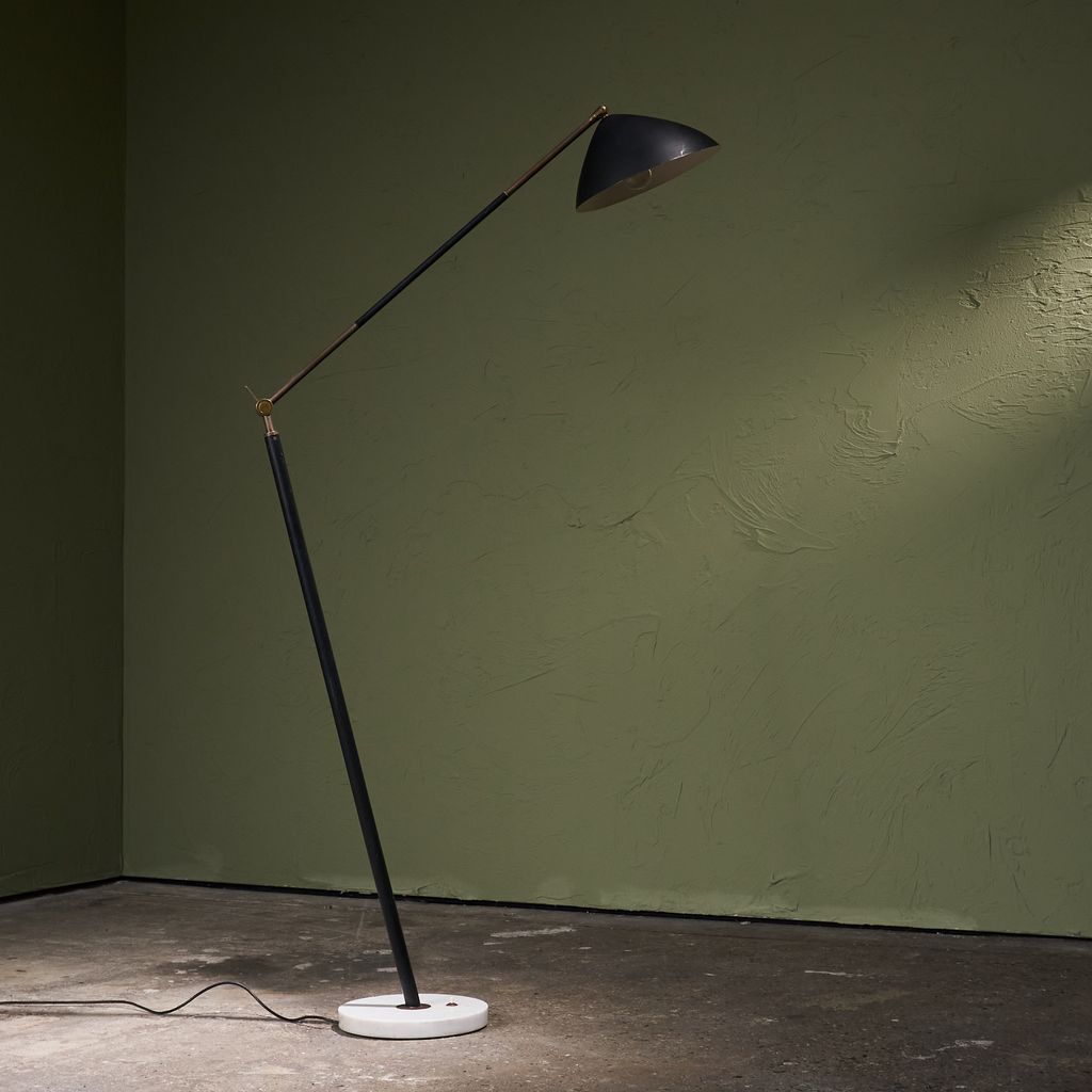 This Floor Lamp from the 1960s by Stilux Milano features base of marble supports a stem placed on a diagonal axis. This stem connects to a swivel made of brass, allowing rotation and controlled movement. From the joint, another stem extends and permits height changes through a system of positions. Each change engages the swivel structure. The upper end carries a shade in a round form. The construction demonstrates balance through geometry and motion. Material contrast appears through the meeting of stone and metal. The object shows design intent, mechanical clarity, and production focus.
