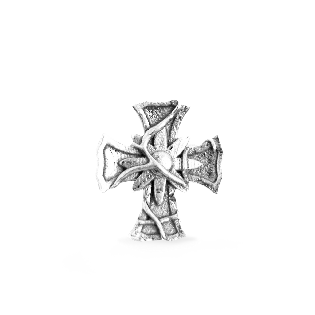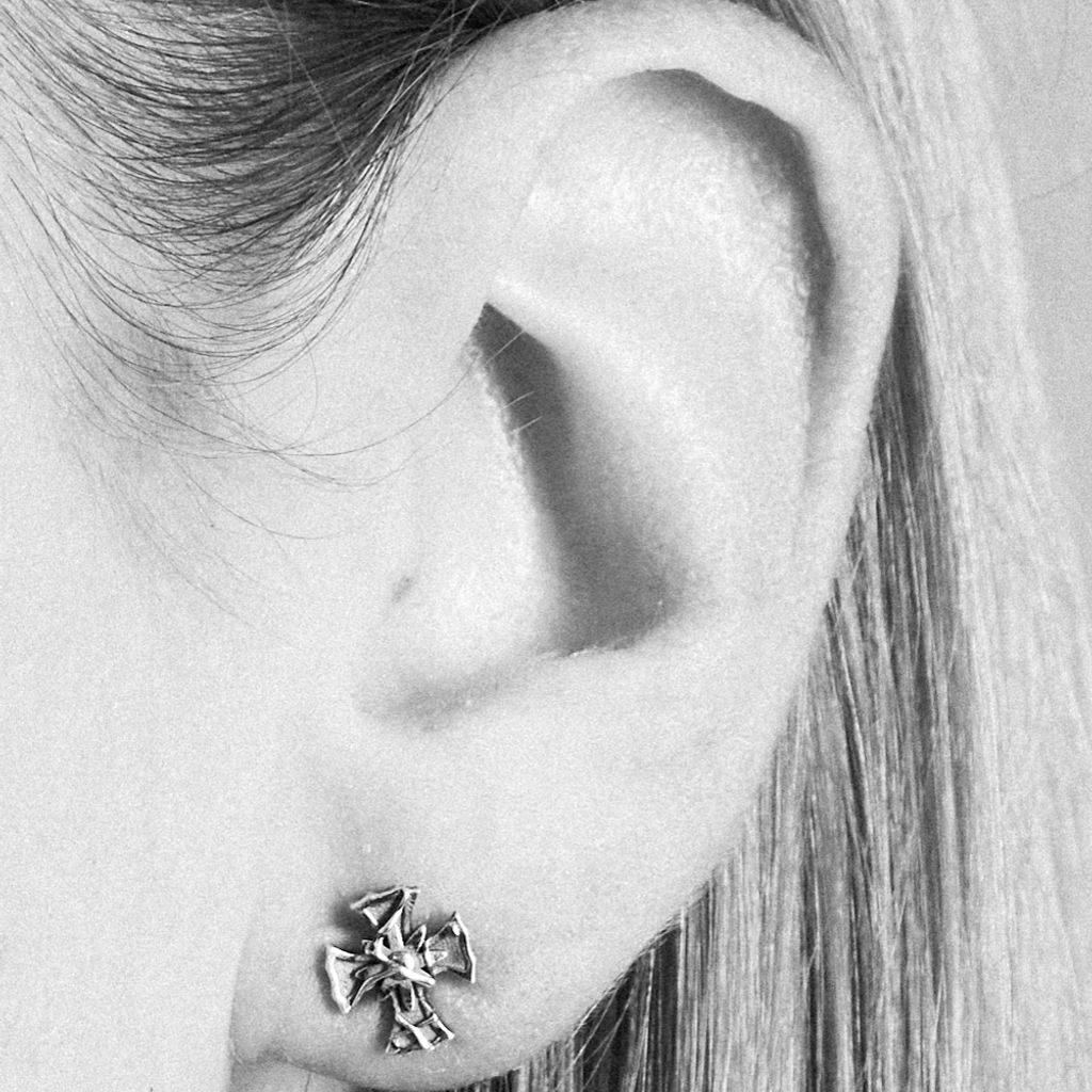 A flower blooms from the center of a floral cross wrapped in vines. Fine and detailed Sterling Silver, for daily wear. Wear solo, or stack and pair with our other earrings.