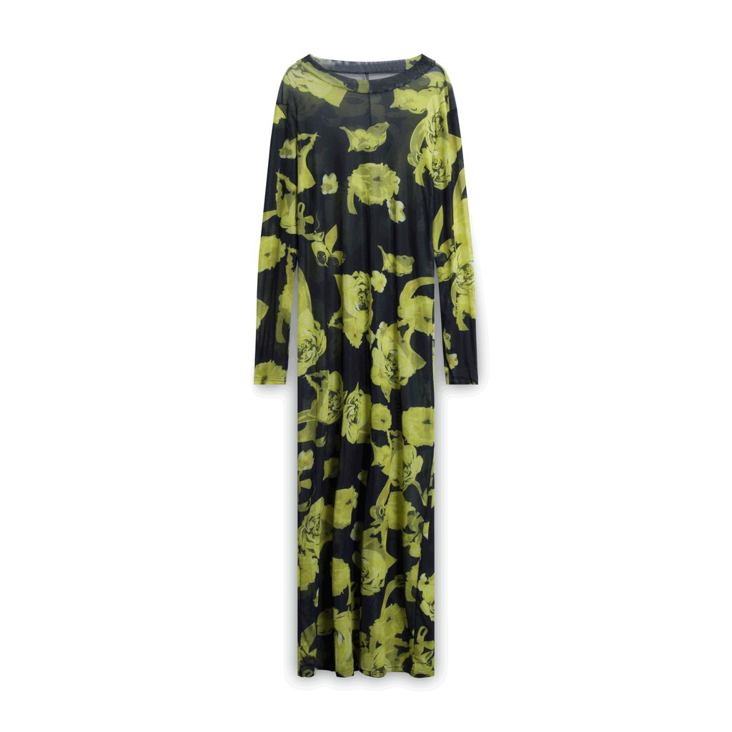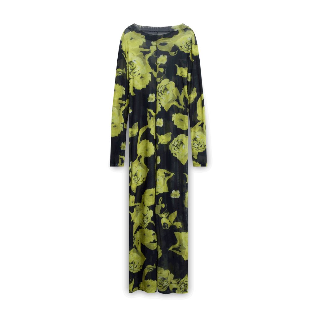 Form fitting lace dress features yellow floral design