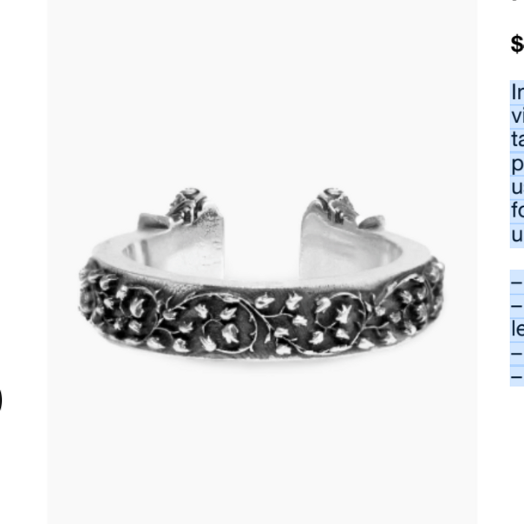 Intricate Sterling Silver Ring wrapped in flowering vines. Corinthian column capitals. Selective tarnishing illuminates fine details and reveals the passage of time, inviting you to look closer. We use only solid Sterling Silver in all of our pieces for timeless, heirloom quality, which will age uniquely over generations.