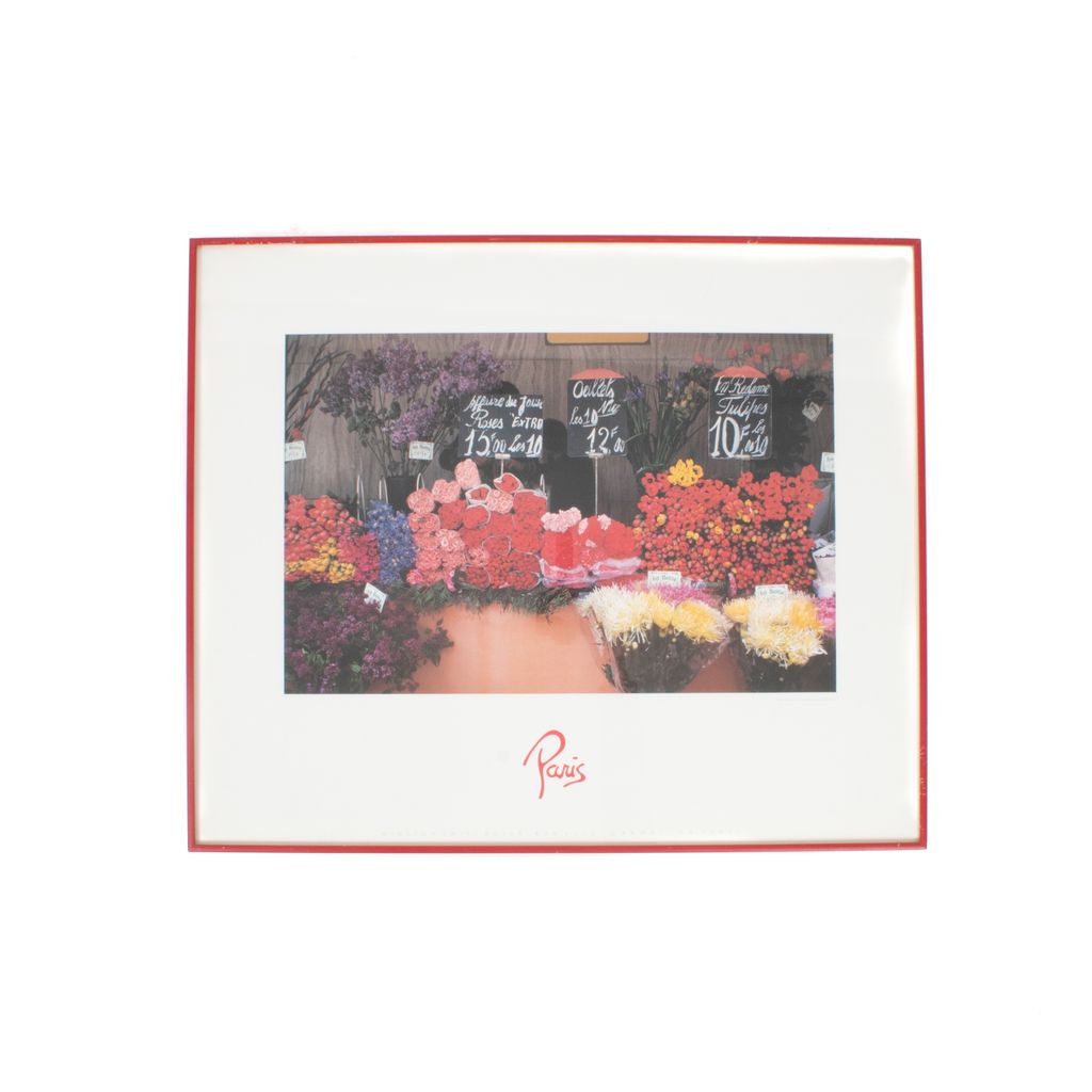 Offset Lithograph by Winston Swift Boyer entitled "Flower Market Paris". The Offset Lithograph is 20 inches in length by 13 inches in height. The year of this Offset Lithograph is 1986 and it's from an unknown edition size. The "Flower Market Paris" is paired with a red frame to highlight this unique piece.