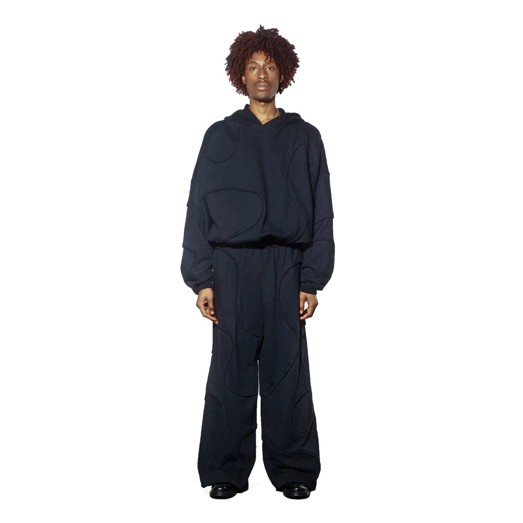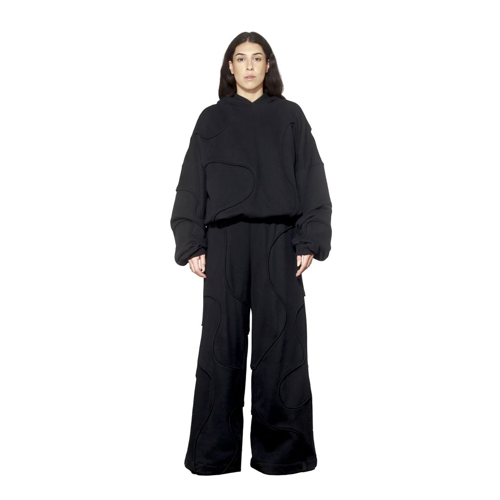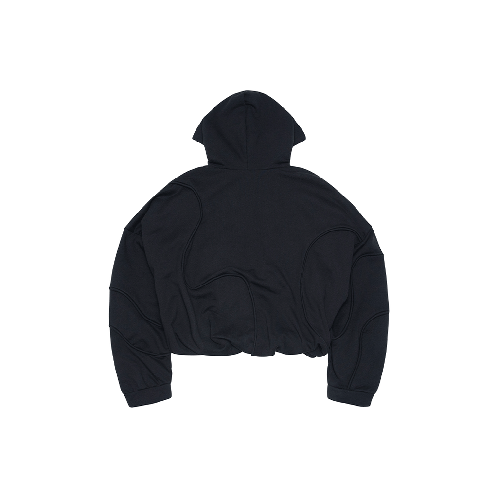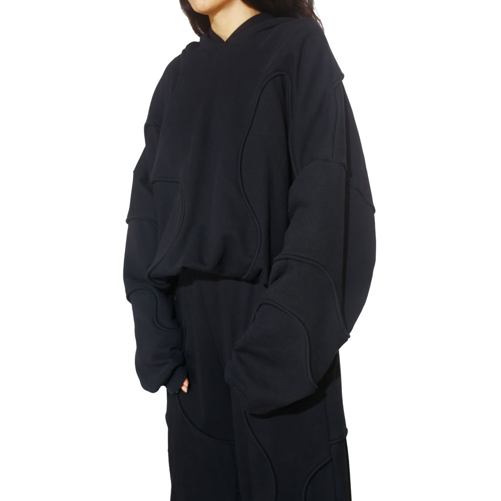 Fluidity Hoodie is a relaxed hooded sweatshirt that features swirled corded detail, hidden elastic along hem line for bubble effect, extra long sleeves, ribbed cuffs, and unisex fit.