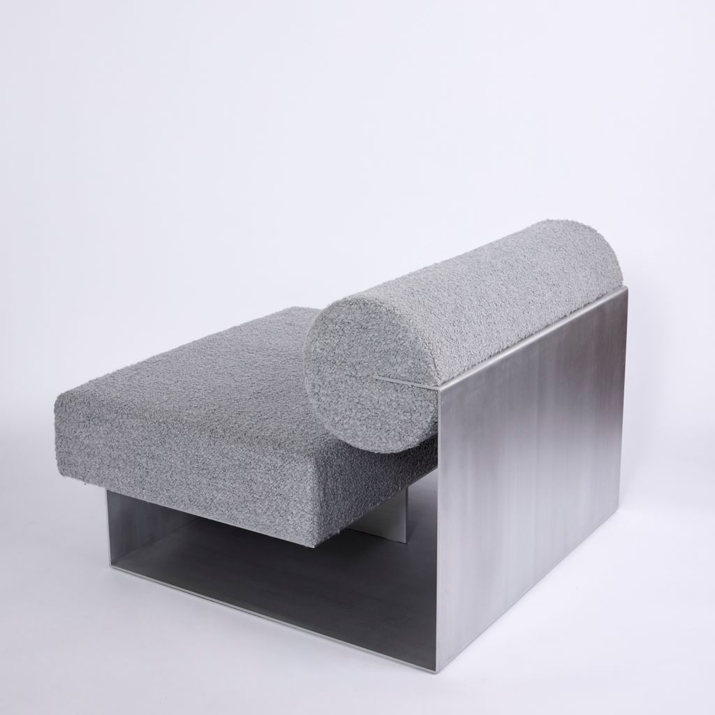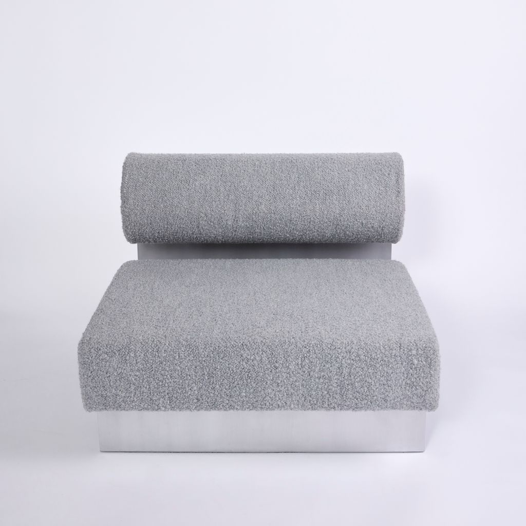 Composition: Aluminum and grey boucle upholstery.