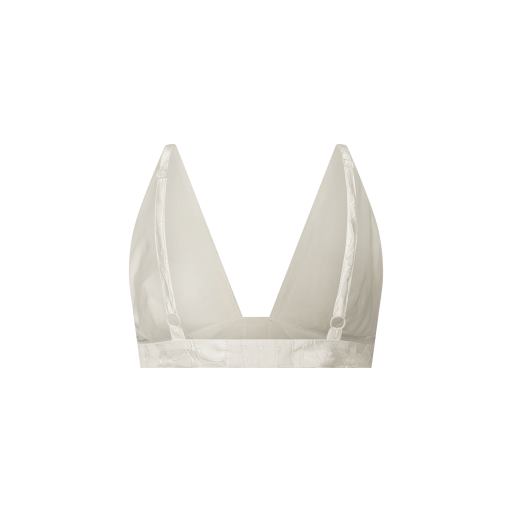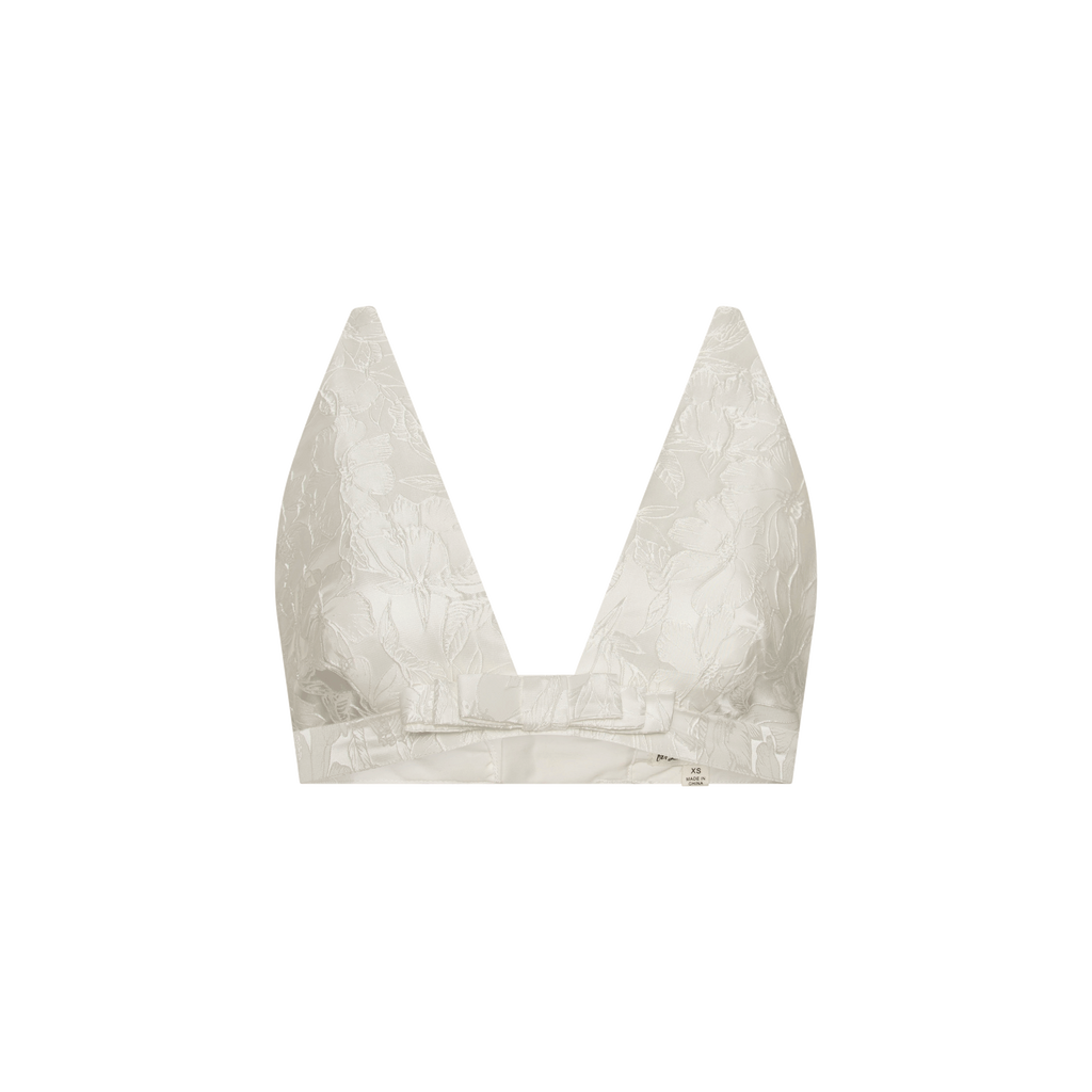 For Love & Lemons White Floral Bralette features bow at chest, adjustable straps, hook and eye back closure, and white floral pattern.