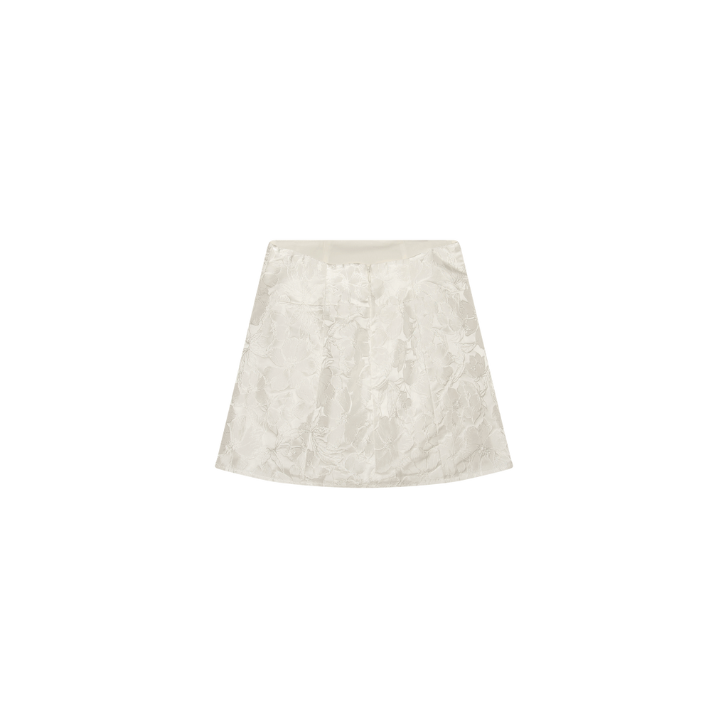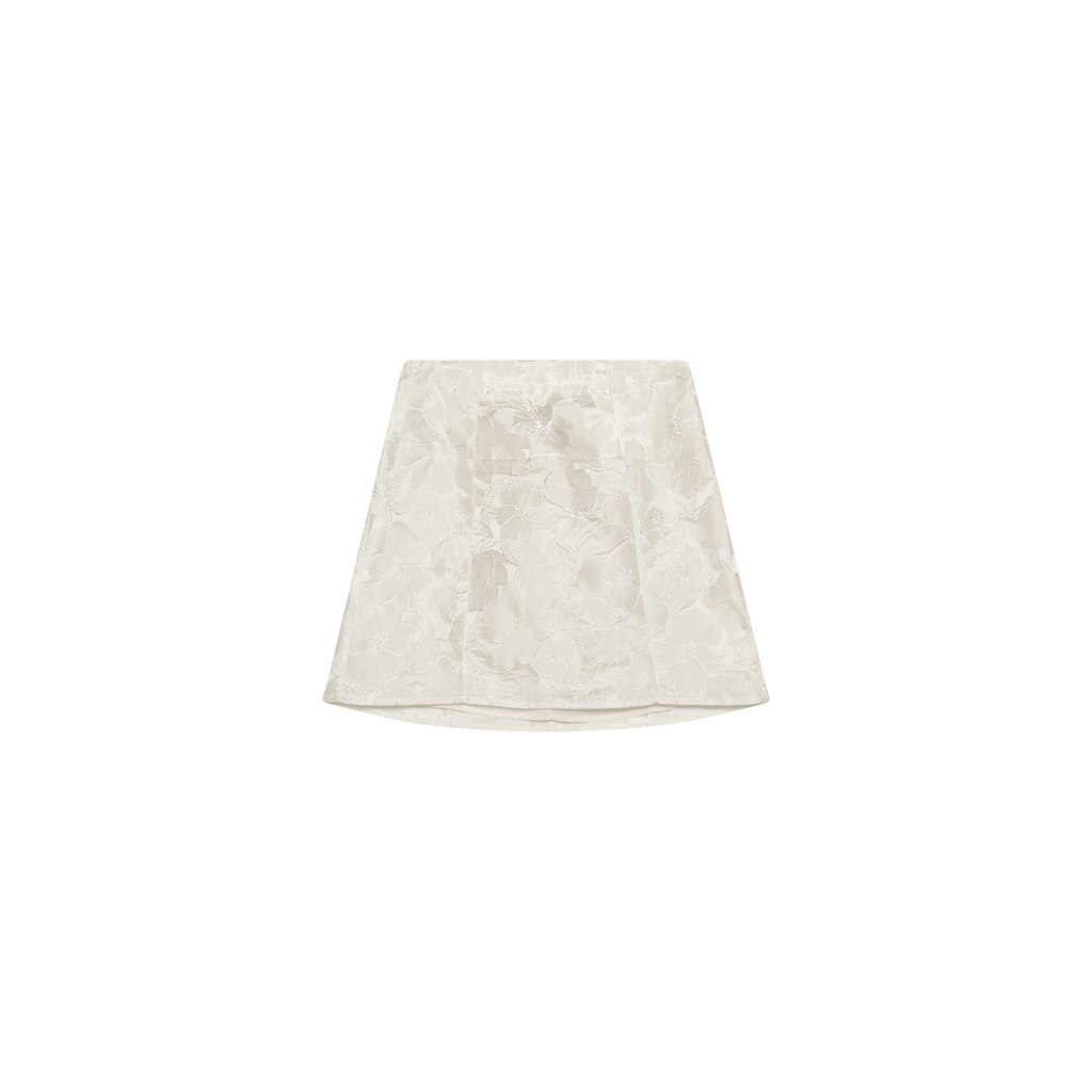 For Love & Lemons White Floral Mini Skirt features high waist, hidden back zipper, and white floral pattern.